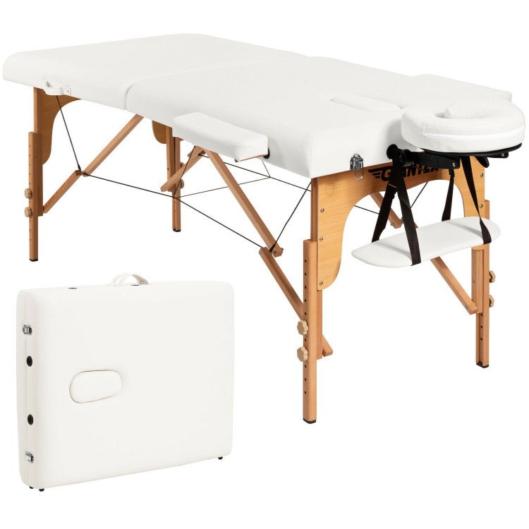 Adjustable height to fit therapists of different heightsFoldable and portable design for easy transportation and storageComfortable lying experience thanks to its high-density sponge and PVC leatherHold up to 441 lbs because of reinforced beech frame with support steel cablesIncluded headrest, armrests and hand pallet provide extra comfortSuitable for spa, massage, facial care, tattoo and foot massage, etcEasy installation with detailed instruction