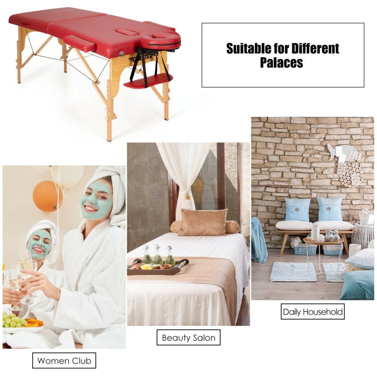 Adjustable height to fit therapists of different heightsFoldable and portable design for easy transportation and storageComfortable lying experience thanks to its high-density sponge and PVC leatherHold up to 441 lbs because of reinforced beech frame with support steel cablesIncluded headrest, armrests and hand pallet provide extra comfortSuitable for spa, massage, facial care, tattoo and foot massage, etcEasy installation with detailed instruction