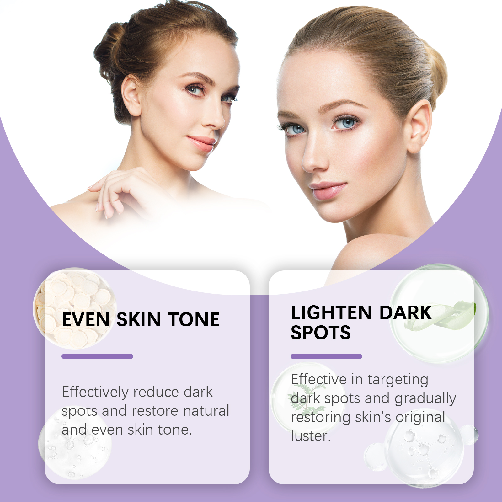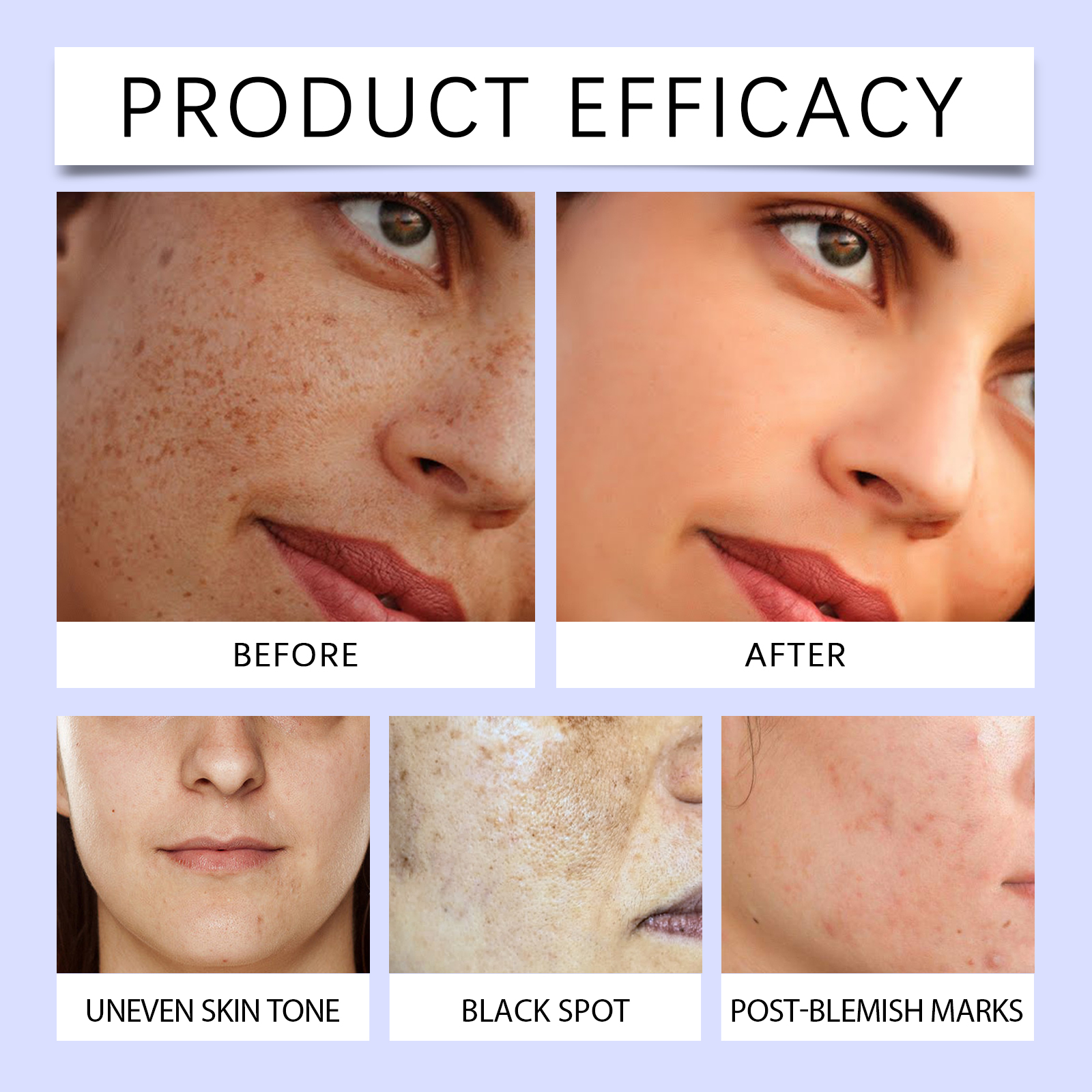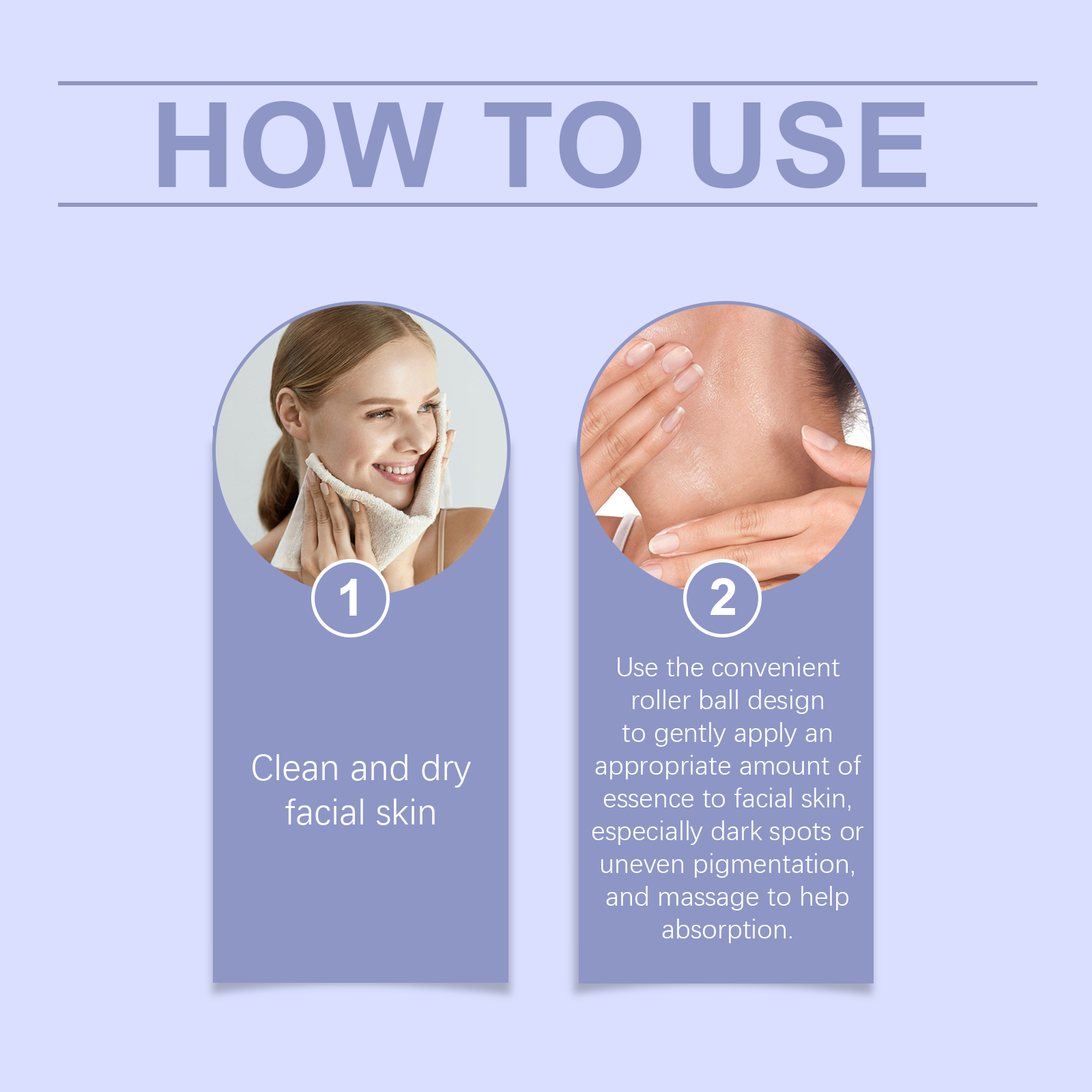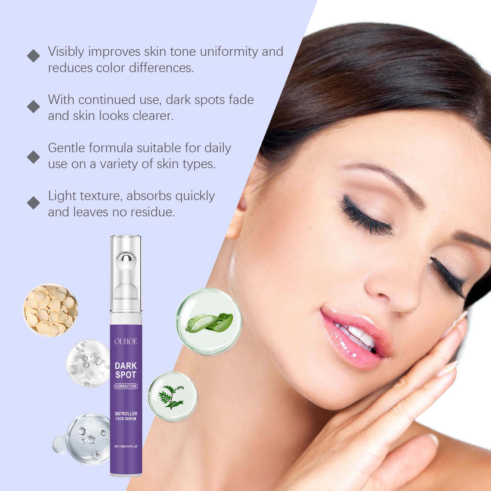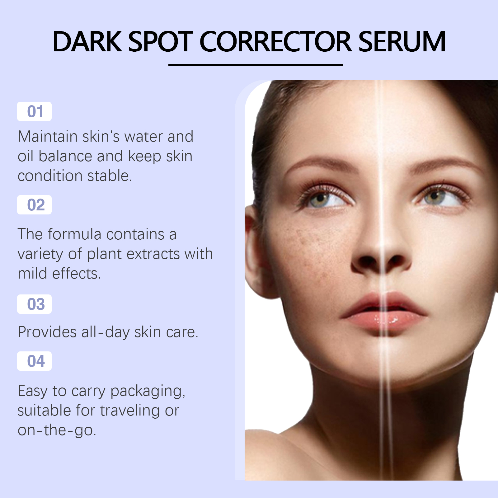 Our facial serum contains glycerin, carbomer. It can be light, easy to be absorbed by the skin, comfortable to use; Strengthen skin barrier and improve skin resistance. Maintain skin water and oil balance, keep skin condition stable; The formula contains a variety of plant extracts for mild effects. All day skin care. Its application method is simple: 1. Clean and dry facial skin; 2. Use the convenient rolling ball design to gently apply the appropriate amount of essence to the face, especially for dark spots or uneven pigmentation. Massage helps absorption. Dark Spot Whitening serum effectively reduces dark spots and restores natural and even skin tone. Effective against dark spots, gradually restore the original luster of the skin. Daily use sustainably improves skin quality and enhances skin health.