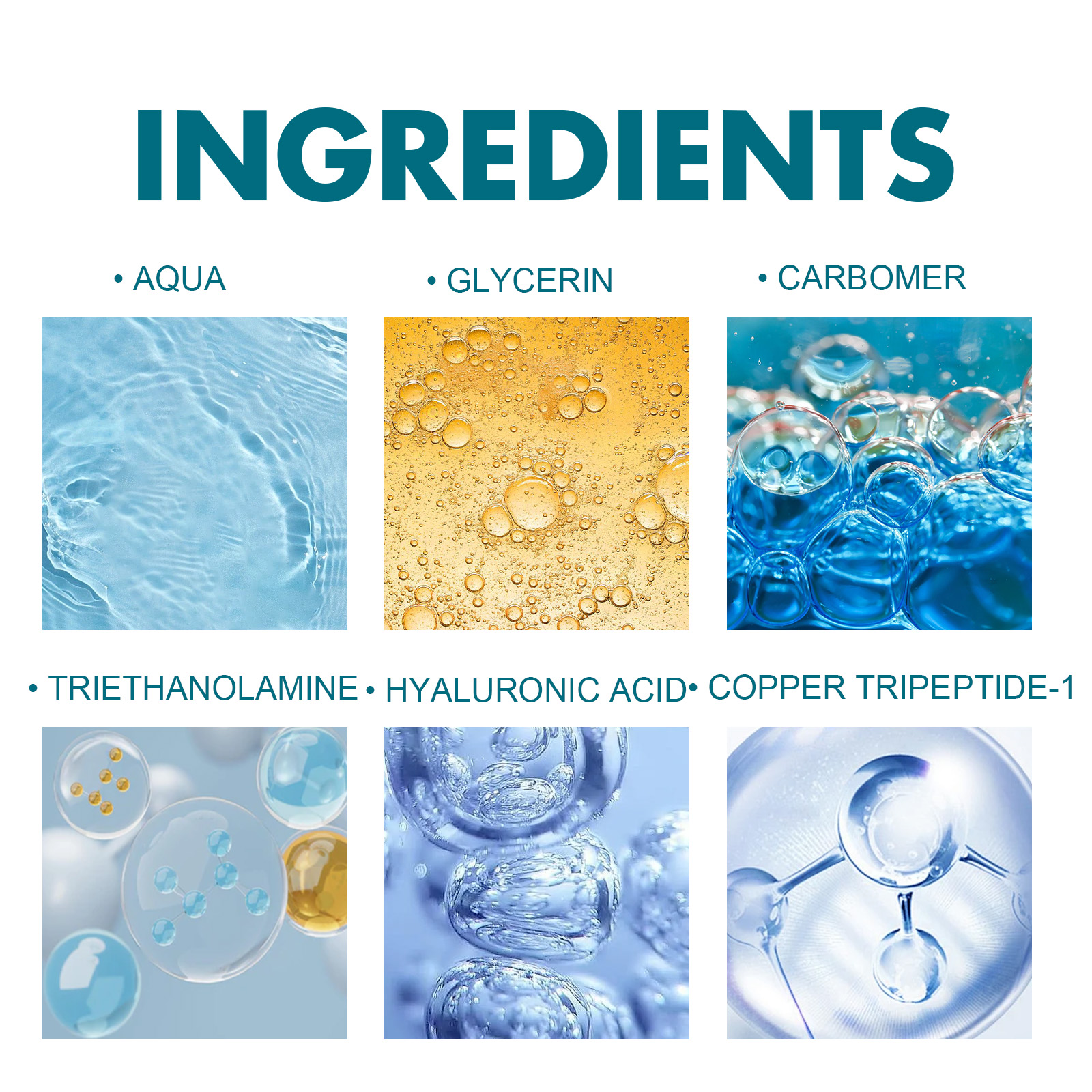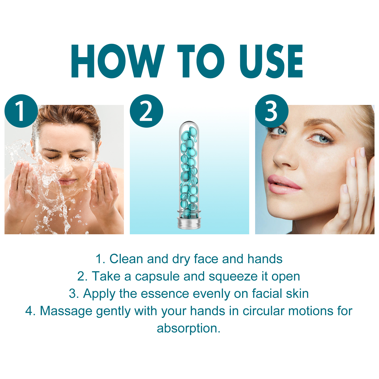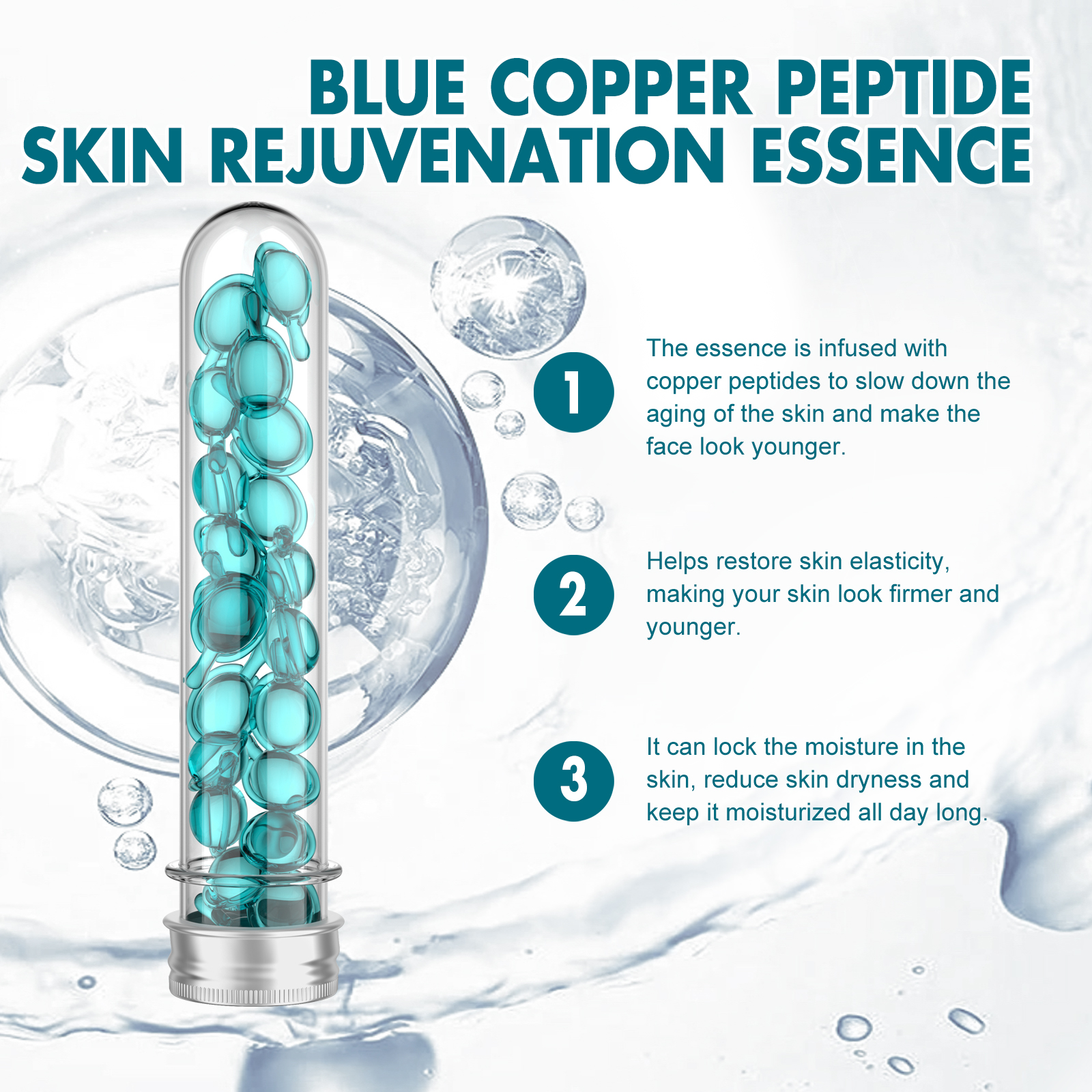 Our Blue Copper Peptide Skin Rejuvenation Essence contains Glycerin, Copper Tripeptide, Sodium Hyaluronate. It slows skin aging, makes the face look younger, helps restore skin elasticity, makes your skin look firmer and younger, locks in moisture, reduces dryness and keeps skin hydrated throughout the day. Its application is simple: clean and dry your face and hands, take out a capsule, squeeze it open, apply the serum evenly to your face, and gently massage with your hands in circular motions until absorbed. It can deeply moisturize the skin, reduce dryness and roughness, and keep the skin hydrated. The ingredients are mild and suitable for all skin types, including sensitive skin.