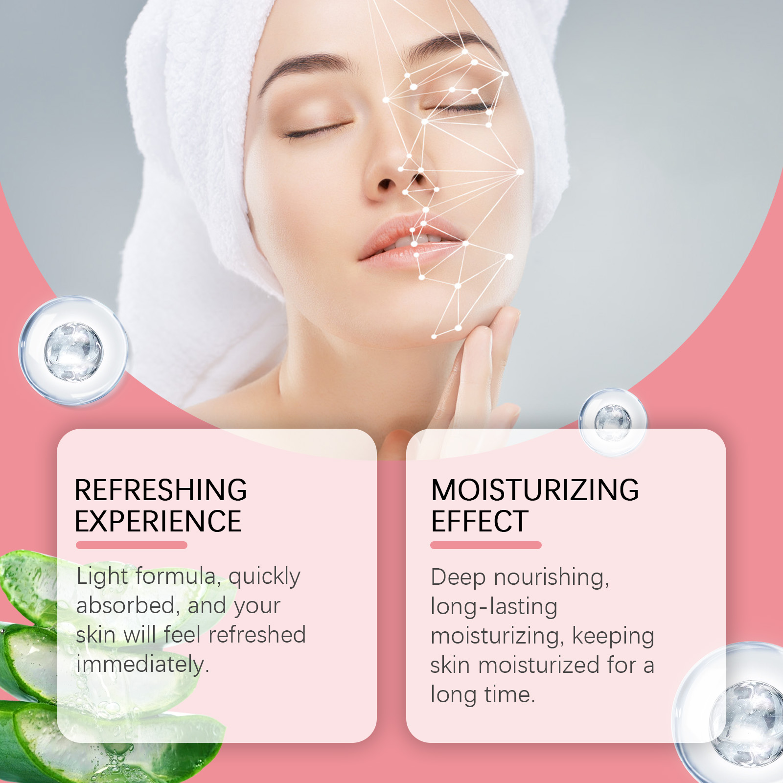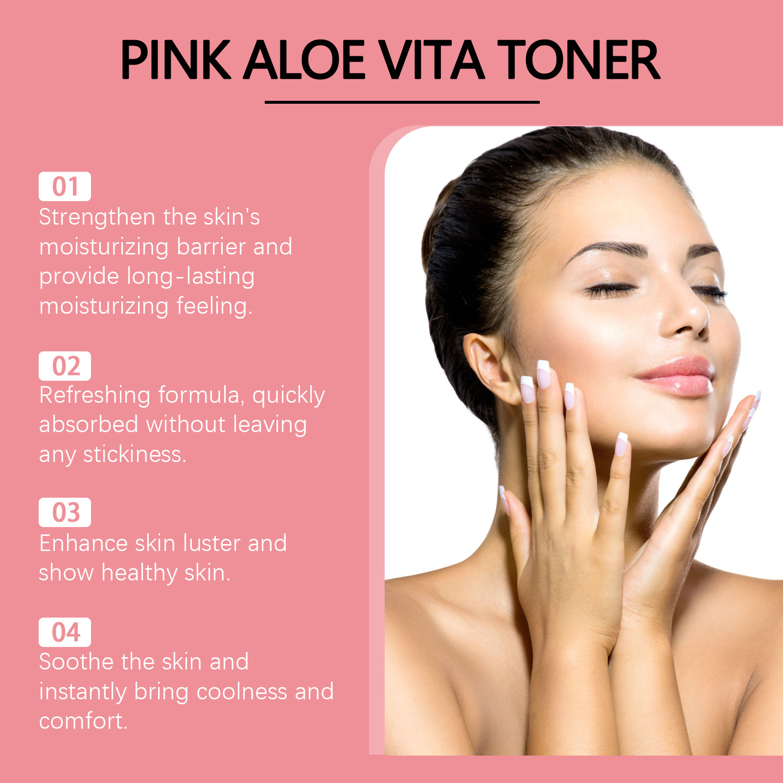 Our aloe vera soothing toner is carefully formulated with aloe vera curacao leaf extract, niacinamide and ascorbic acid (vitamin C). Designed specifically for deep nourishment and long-lasting moisture retention. The usage method is extremely convenient: 1. Clean the facial skin and keep it dry; 2. Apply an appropriate amount of this product evenly to the facial skin. 3. Gently massage until fully absorbed. And it can help balance skin tone and brighten it.