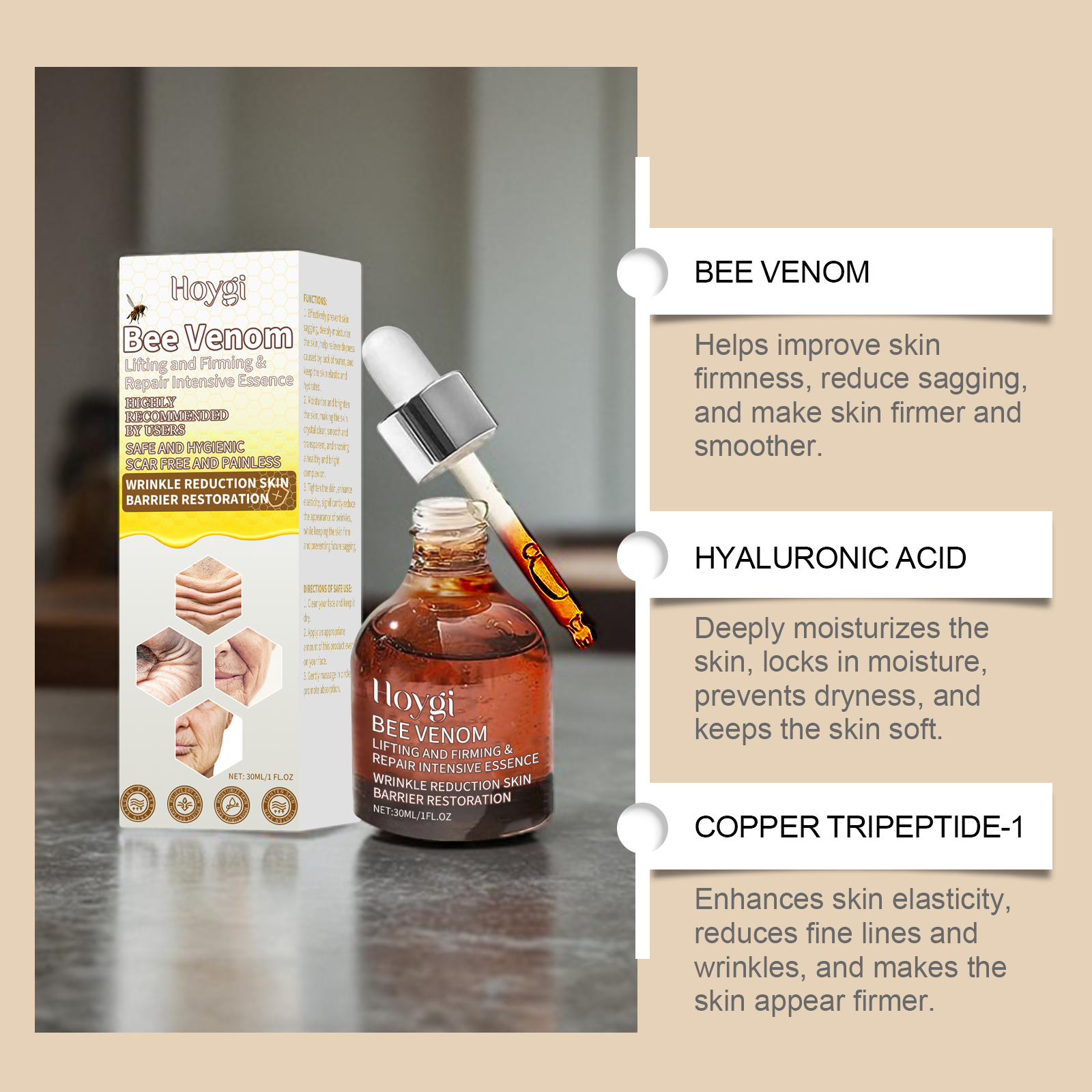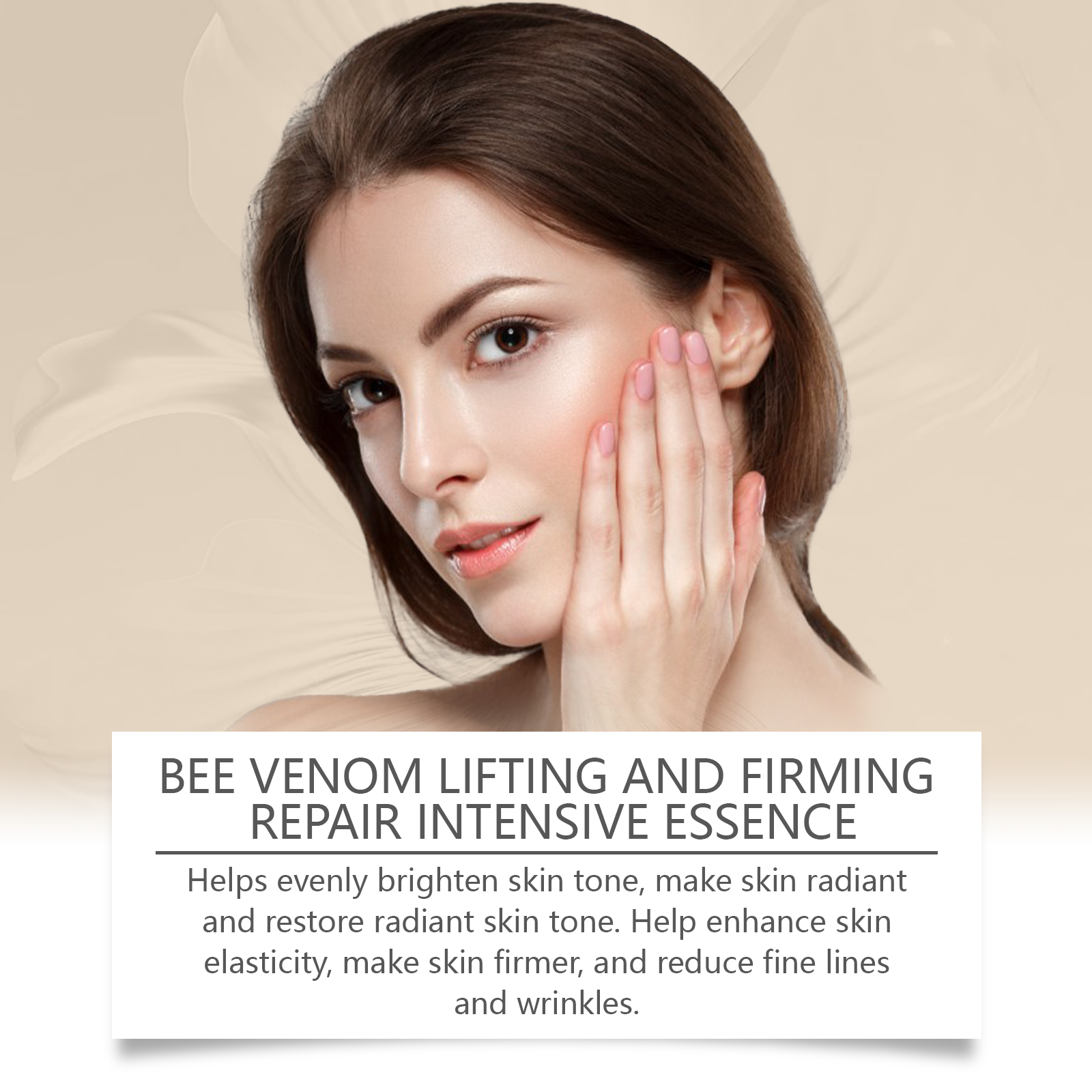 Our facial moisturizing essence contains bee venom, hyaluronic acid and vitamin C. It can help improve skin firmness, reduce sagging, and restore skin elasticity and firmness. The application method is very simple: clean your face and keep it dry. Take an appropriate amount of this product and apply it evenly on your face. Gently massage in circular motions to promote absorption. Deeply nourish the skin, relieve dryness, and keep the skin soft and moist throughout the day.