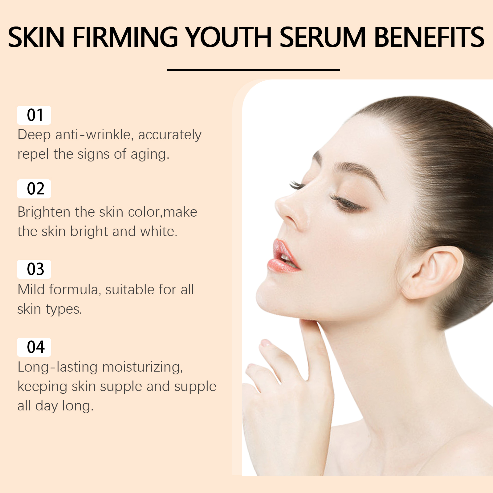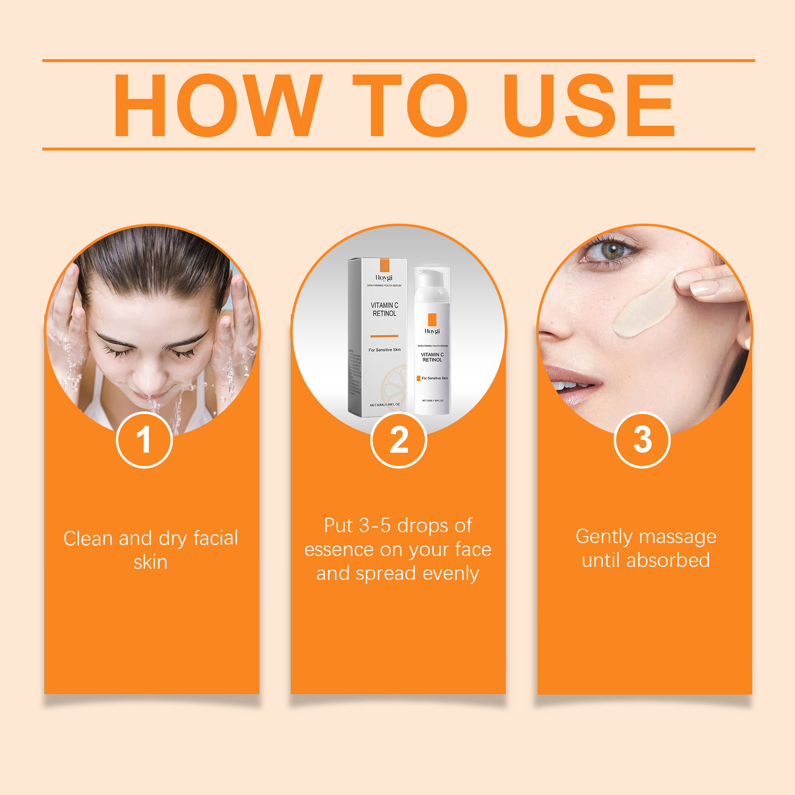 Our retinol Vitamin C Anti-wrinkle serum contains vitamin C and retinol. It gives you a refreshing texture, doesn't clog pores, and allows you to breathe more freely. Its application method is very simple: clean dry facial skin, apply 3-5 drops of essence to the face, evenly spread, gently massage until absorbed. And can lock in moisture, skin hydrated and full.