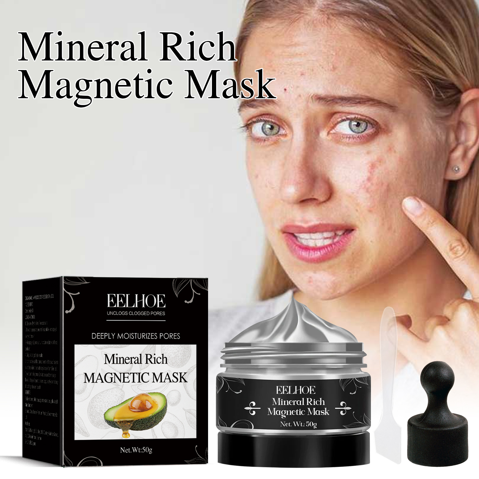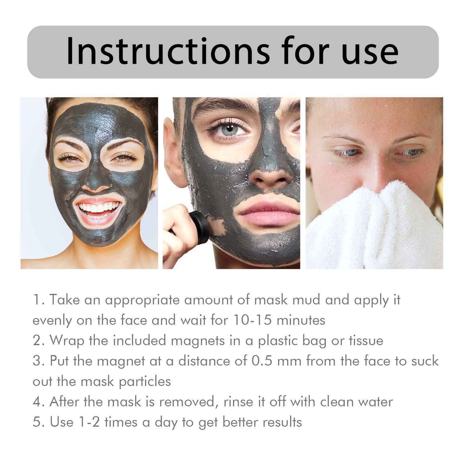 Our blackhead removal mask is carefully formulated with kaolin and glycerin. Specifically designed to magnetize a mineral-rich combination, our mask can penetrate deep into the pores and, with the help of skin-friendly magnets, extract the mask along with any skin waste stuck in the pores. The usage method is extremely convenient: 1. Take an appropriate amount of the mask mud and apply it evenly to your face. Wait for 10 to 15 minutes; 2. Wrap the complimentary magnet in a plastic bag or tissue paper. 3. Place the magnet 0.5 millimeters away from the face screen to suck out the particles on the mask. 4. After removing the mask, rinse it thoroughly with clean water. Using it 1 to 2 times a day can yield better results. Magnetize skin waste, remove it from pores, keep pores unobstructed, and deeply moisturize pores.