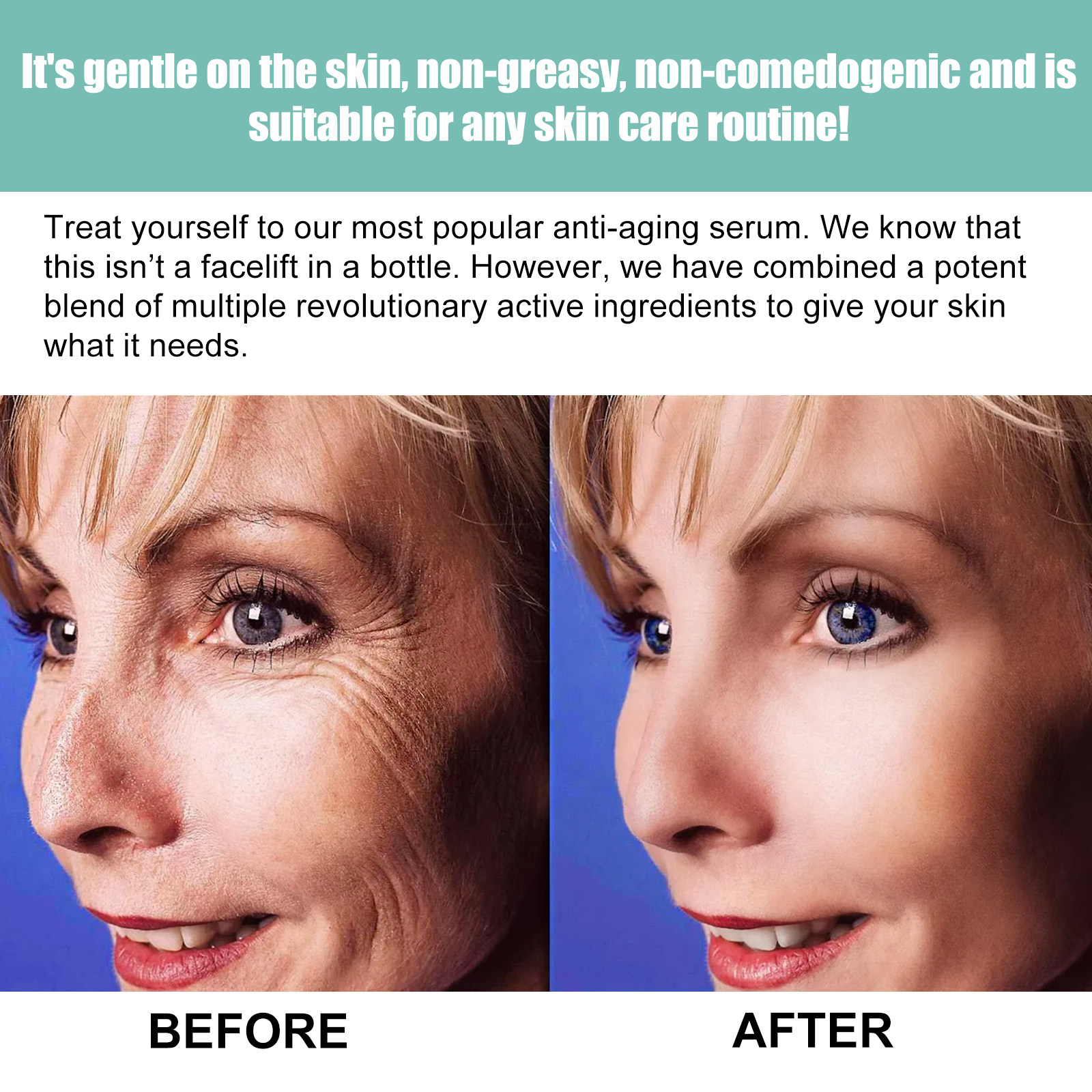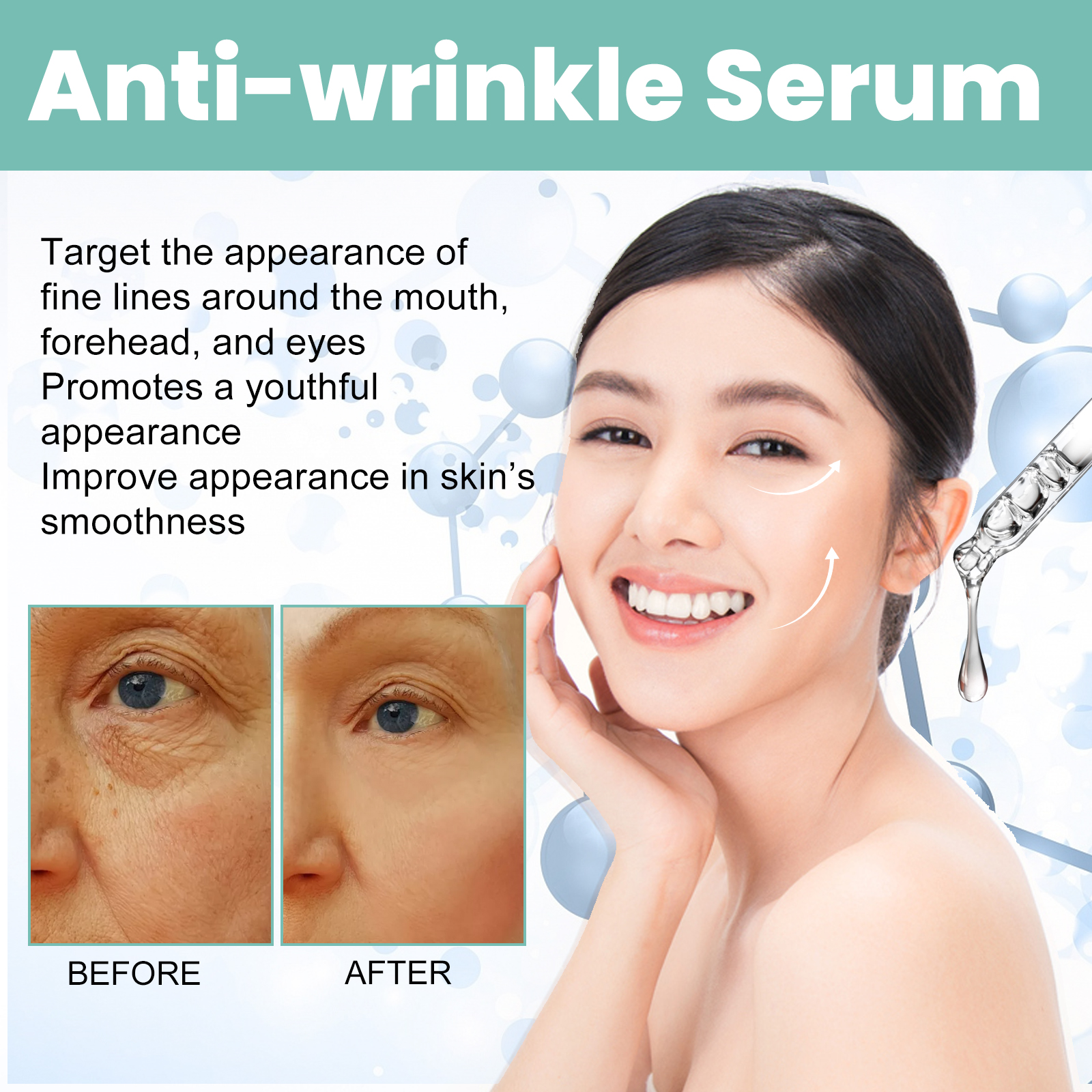 Our facial essence contains palmitoyl tetrapeptide-7, common bamboo leaf/stem extract, and pea extract. It can penetrate the skin, form elasticity on the surface, wrap around the skin, have a texture like water, be light and refreshing, not sticky, reduce wrinkles and nourish the skin. Its usage method is very simple: 1. After cleansing and toning the face, take an appropriate amount of this product in the palm of your hand; 2. Apply along the skin texture of the face; 3. Gently massage until absorbed by the skin. The anti-aging essence targets fine lines around the mouth, forehead and eyes, making the skin look younger and smoother.