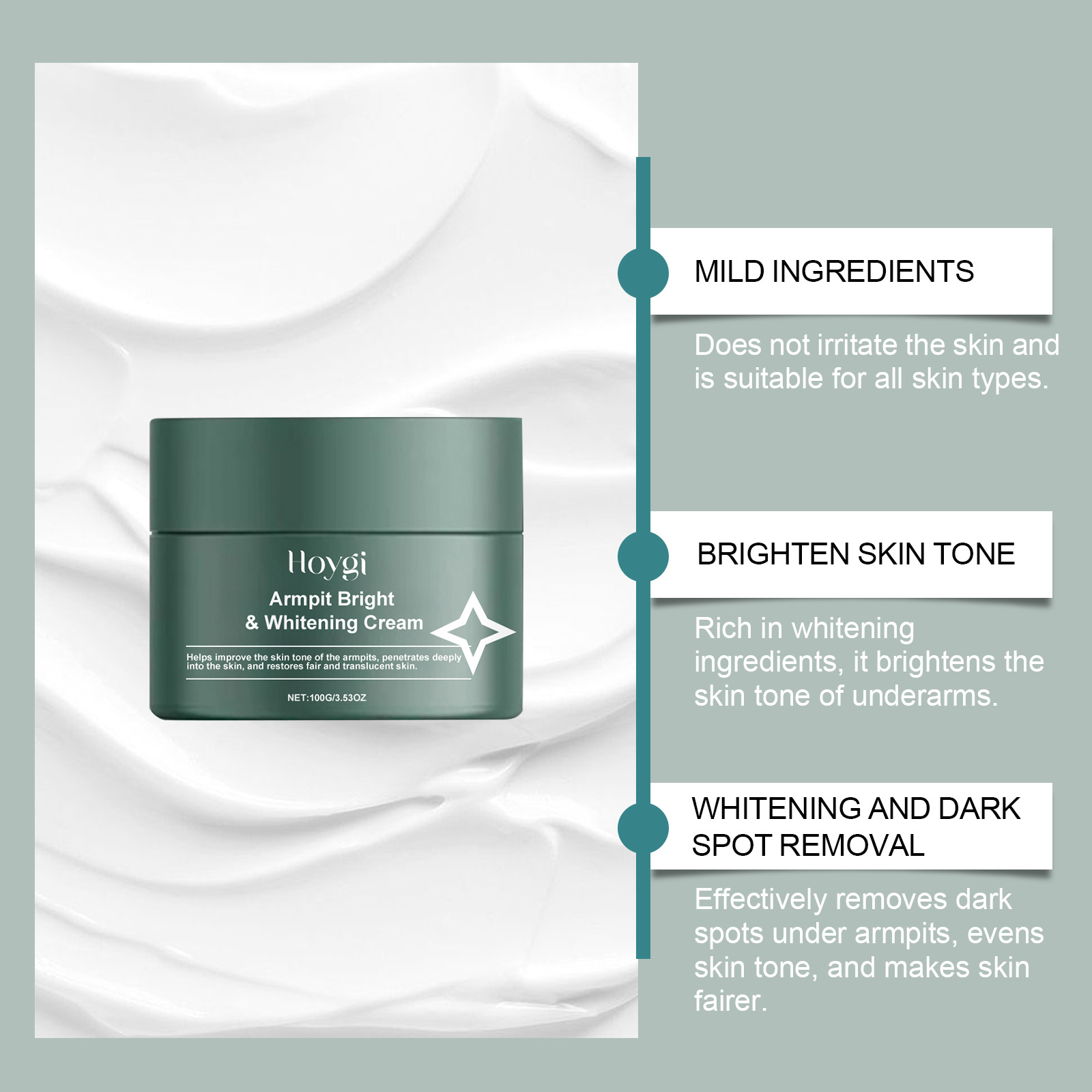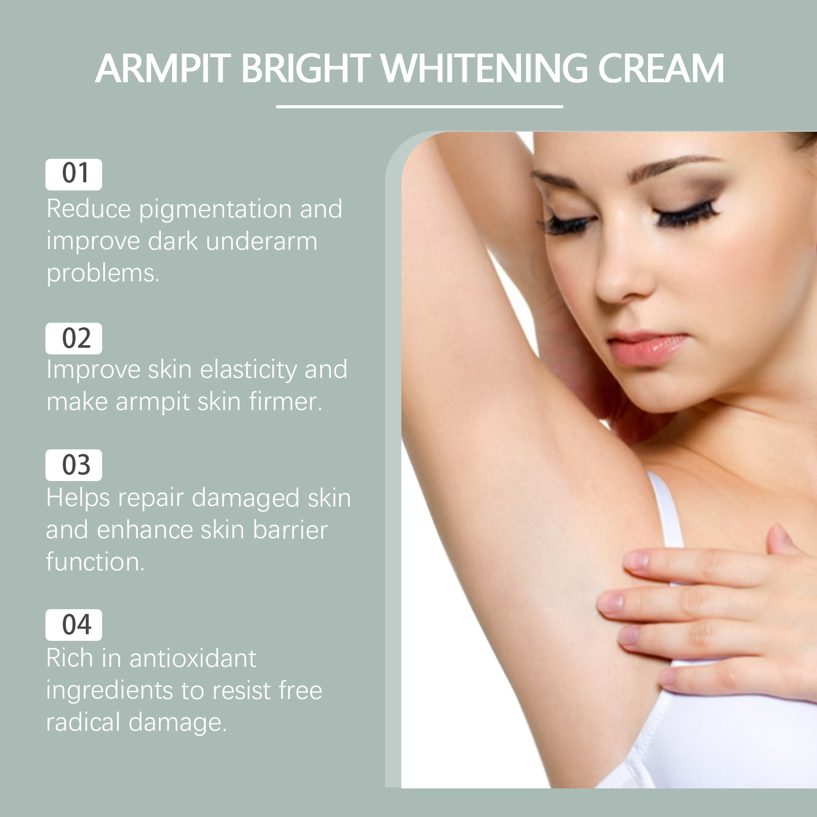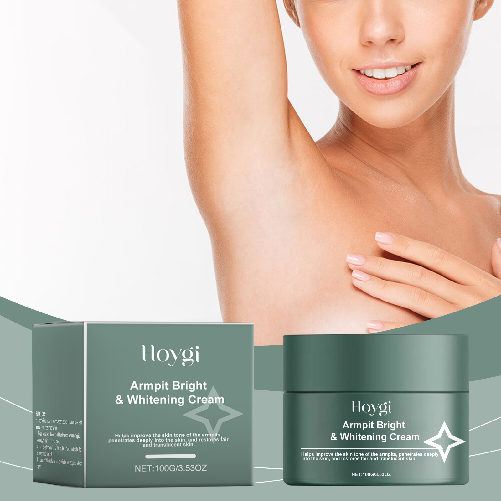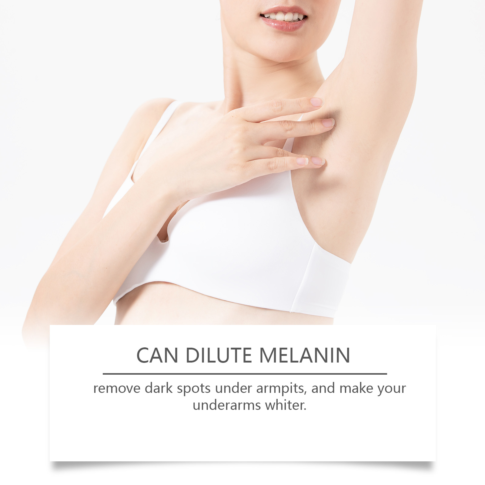 Our body care cream is carefully formulated with hyaluronic acid, tea leaf oil and ascorbic acid (vitamin C). Designed specifically for effectively removing dark spots under the armpits. The usage method is extremely convenient: 1. Thoroughly clean the skin and dry it; 2. Apply an appropriate amount of this product evenly to the skin under the armpits. 3. Gently massage to promote better absorption. And it can even out skin tone and whiten the skin.