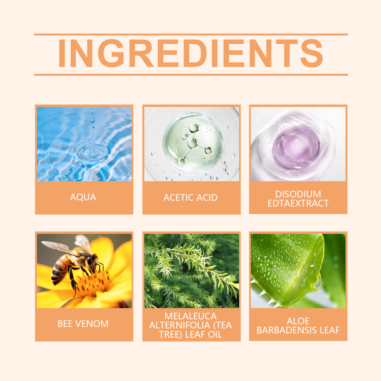 Our bee venom nail care spray is carefully formulated with acetic acid and disodium EDTA. Designed specifically to effectively alleviate onychomycosis, prevent fungal growth and maintain foot health. The usage method is extremely convenient: 1. Wash your feet thoroughly and keep them dry. 2. Shake the bottle and spray it evenly on the affected nail area. Wait for 2 to 3 minutes until it is fully absorbed. It absorbs quickly and is not greasy. After use, the feet feel fresh and comfortable, and say goodbye to the smell.