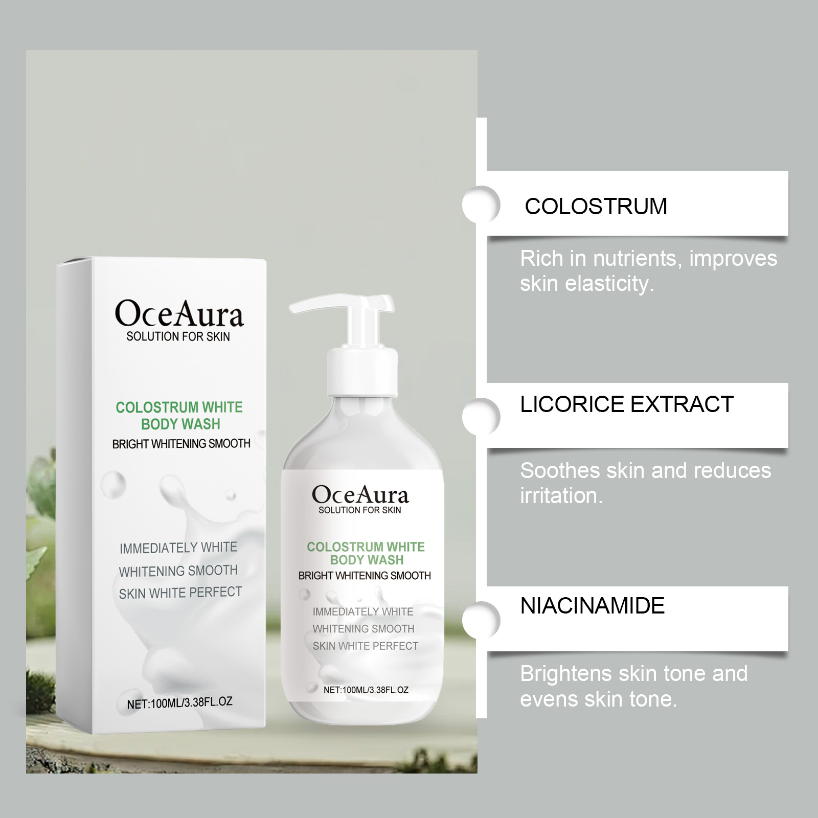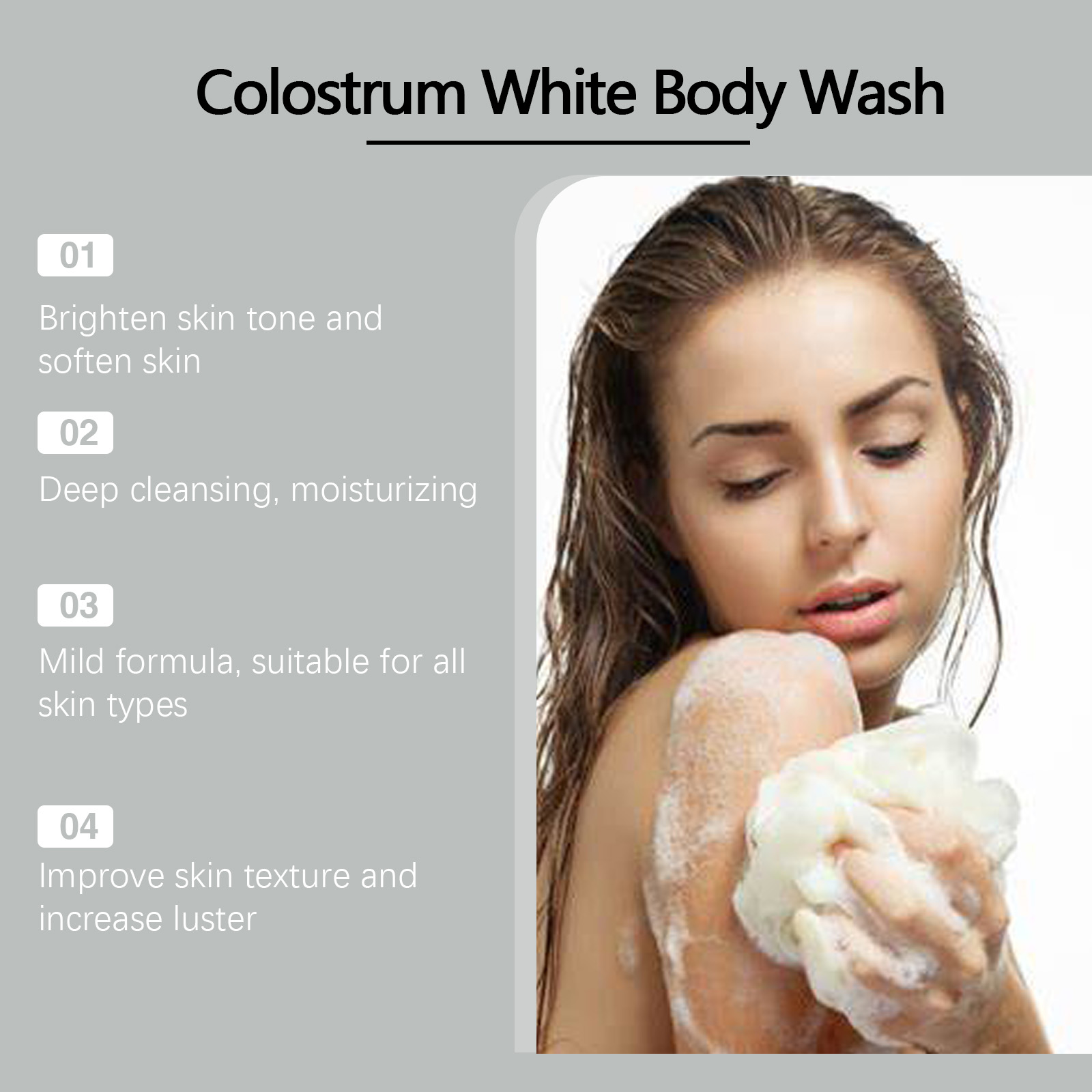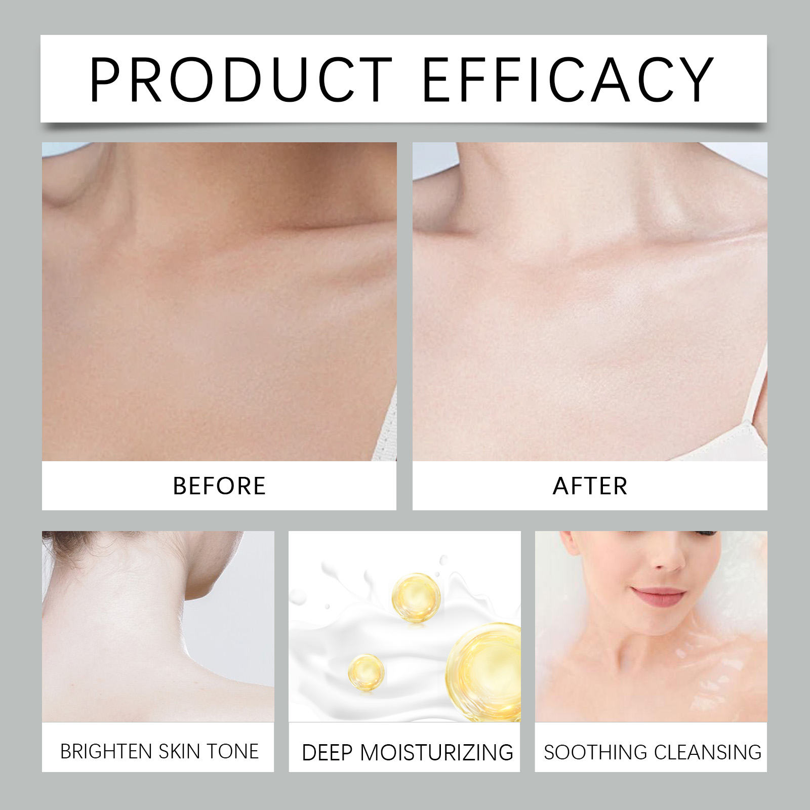 Our body wash contains glycerin, colostrum, licorice extract. It can effectively brighten the entire skin tone and present a natural glow. Rich in moisturizing ingredients to keep skin hydrated and soft. Its use method is very simple: 1. Wet the whole skin with warm water, take a proper amount of body wash on the palm. Then knead into a foam; 2. Evenly apply the foam to the whole body and gently massage to promote absorption; 3. Rinse the foam off your body with warm water. After use, the skin is radiant and full of vitality. Long-lasting moisturizer keeps skin soft and smooth.