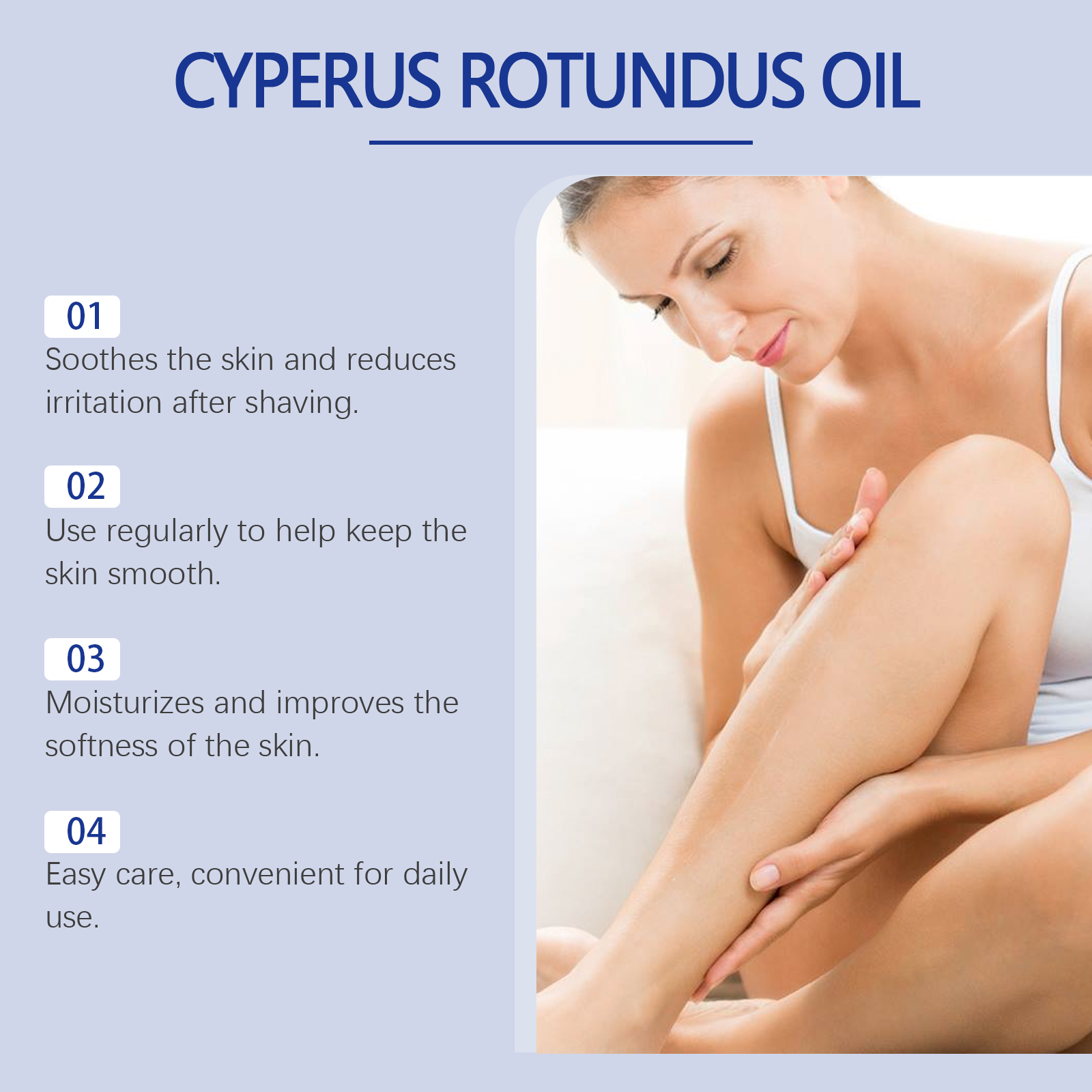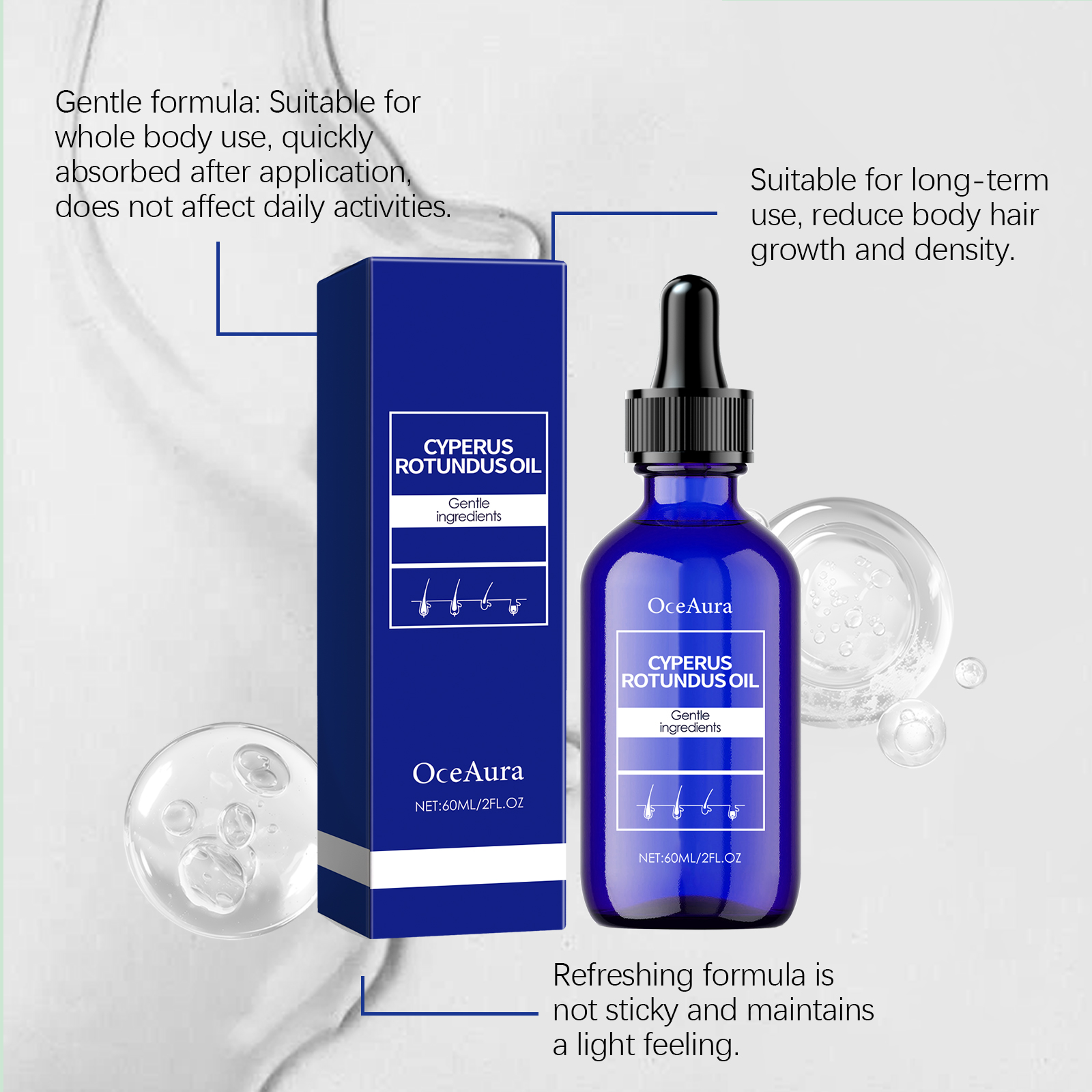 Our essential oils for hair care contain mineral oil and Radix aconite extract. It can effectively reduce body hair and keep skin smooth and delicate. Long-lasting moisturizing effect keeps skin hydrated and reduces dryness. Its application is simple: First, thoroughly clean and dry the skin, and evenly apply an appropriate amount of the product to the skin that you want to slow down hair growth. Massage until fully absorbed. And can gently inhibit the growth of body hair, reduce the appearance of body hair, so that your skin gradually becomes more smooth and delicate.