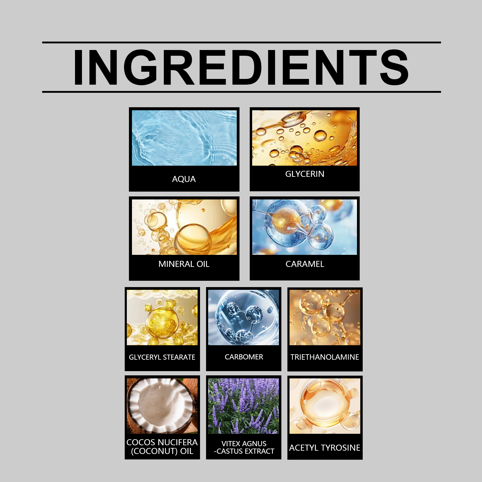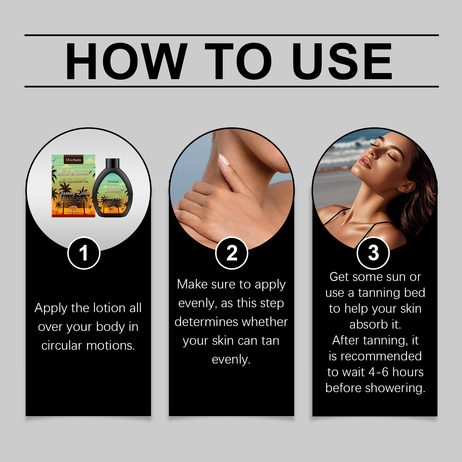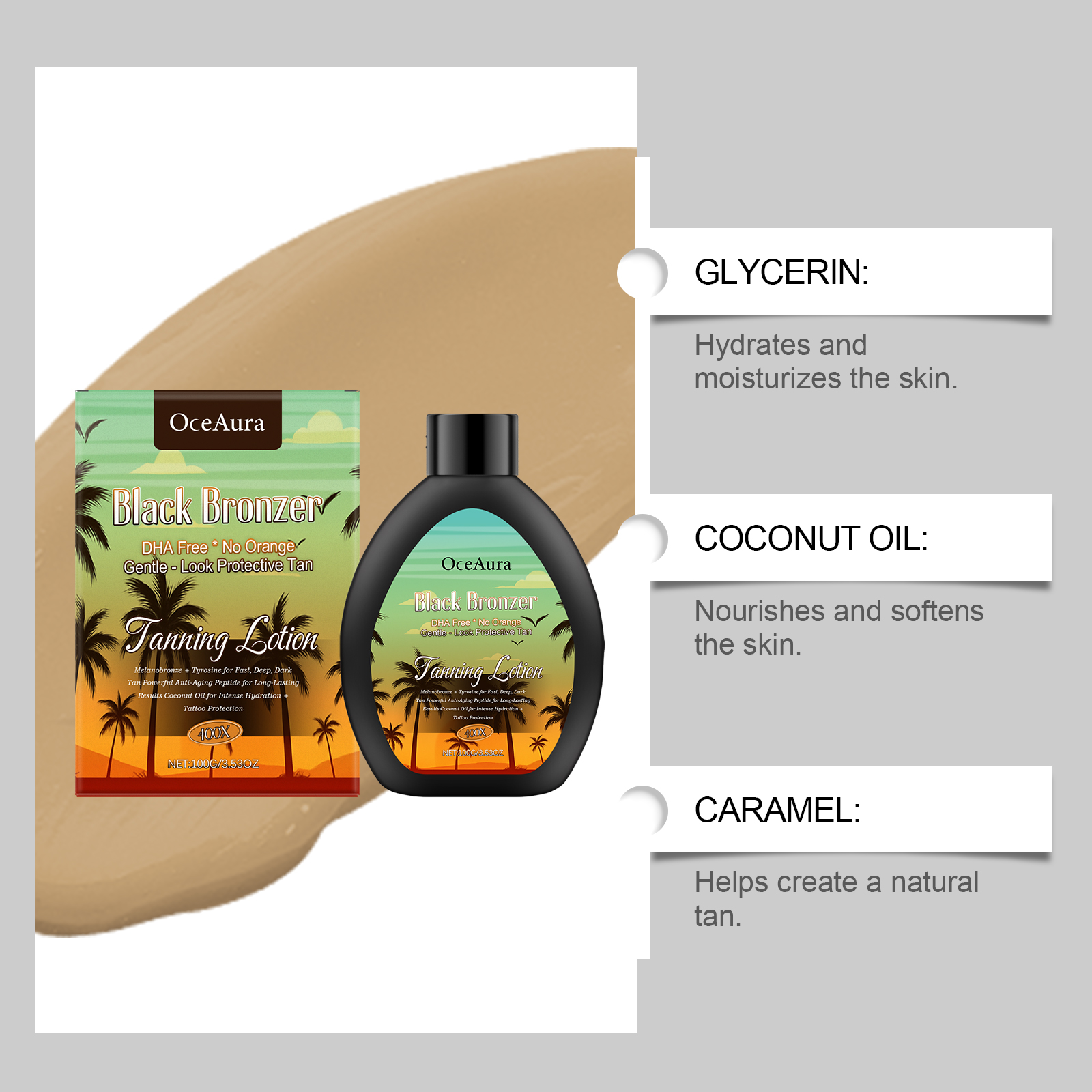 Our coconut blackening lotion is carefully formulated with glycerin, mineral oil and caramel color. Designed specifically for creating a charming and healthy complexion. The usage method is extremely convenient: Apply the lotion all over your body in a circular motion, making sure it is evenly spread as this step determines whether your skin can be tanned evenly. Get some sun exposure or use a tanning bed to help the skin absorb it. After getting tanned, it is recommended to wait for 4 to 6 hours before taking a bath. And it can reduce wrinkles, keep you young and gently care for your tender skin.