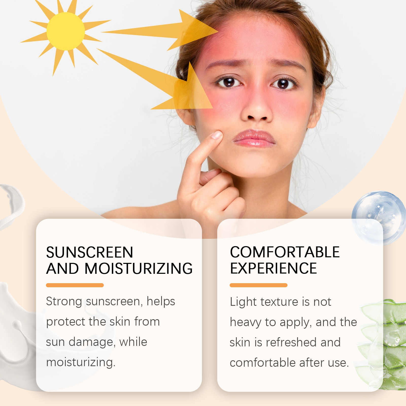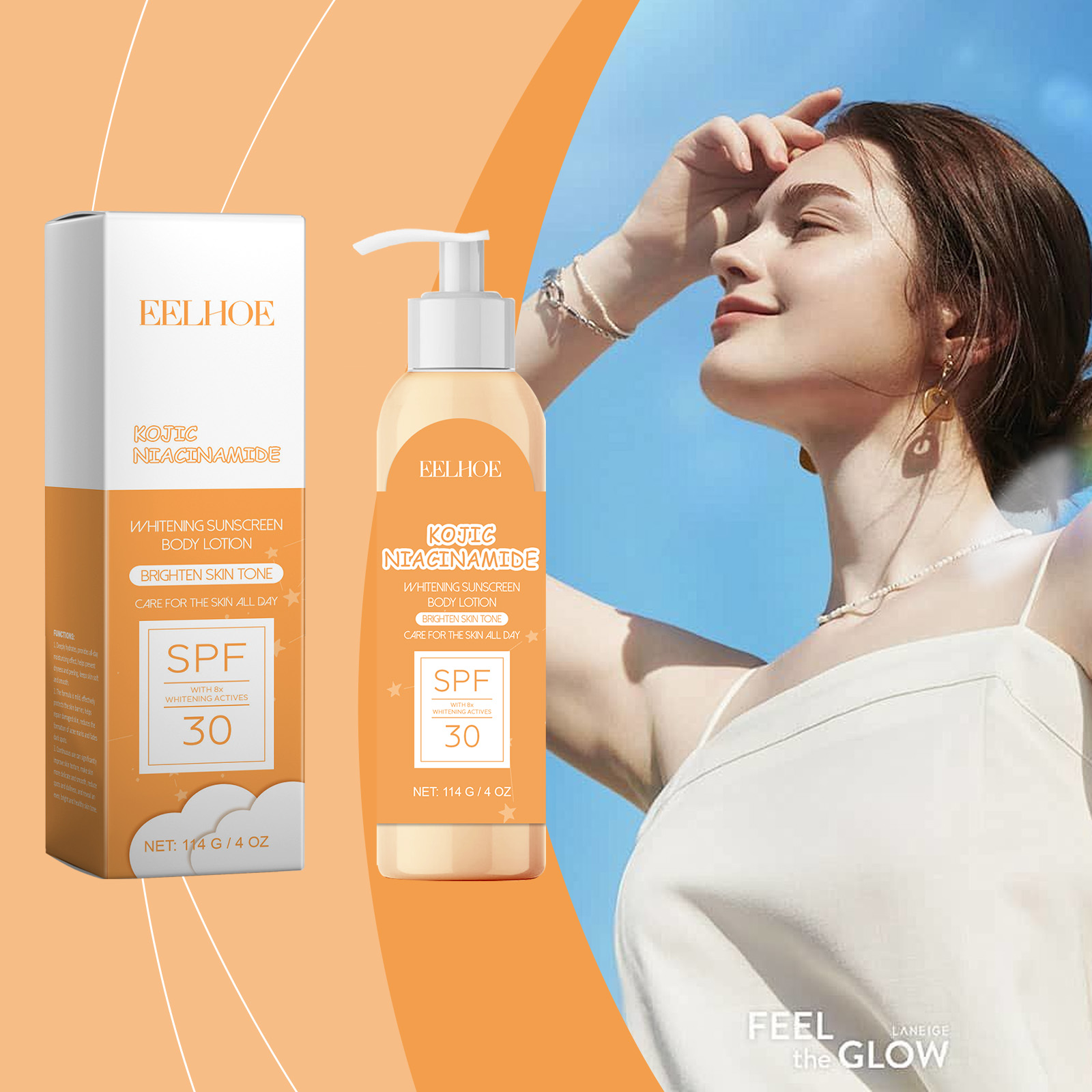 Our whitening sunscreen body lotion contains kojic acid and titanium dioxide. It protects the skin from sun damage while moisturizing. The way to use it is simple: clean the skin and keep it dry. Apply appropriate amount of this product evenly on the skin and wait for absorption. And the texture is light, it is not heavy, and the skin is fresh and comfortable after use.