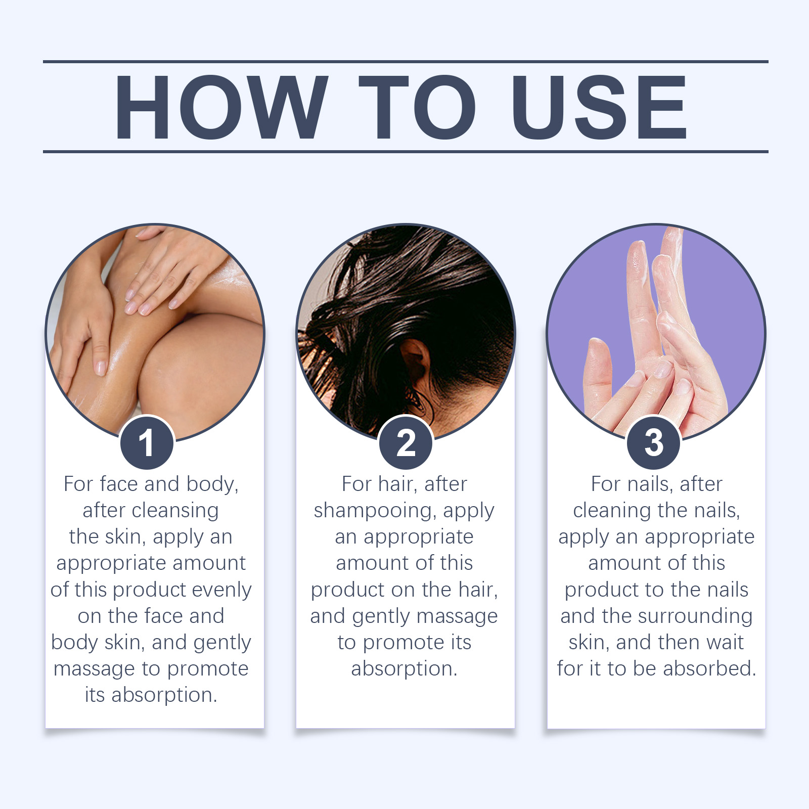 Our body versatile essential oils contain rosemary leaf extract and argan oil. It can multi-function nutrition, care for the whole body, moisturizing. Its application method is very simple: for the face and body, after cleansing, apply appropriate amount of this product evenly on the face and whole body skin, and gently massage to promote its absorption. For hair, after shampooing, apply appropriate amount to hair and massage gently to promote absorption. For nails, after cleaning the nails, apply appropriate amount of this product to the nails and surrounding skin, and wait for absorption. It can effectively lock in skin moisture, continuously replenish water, and keep skin soft and smooth.