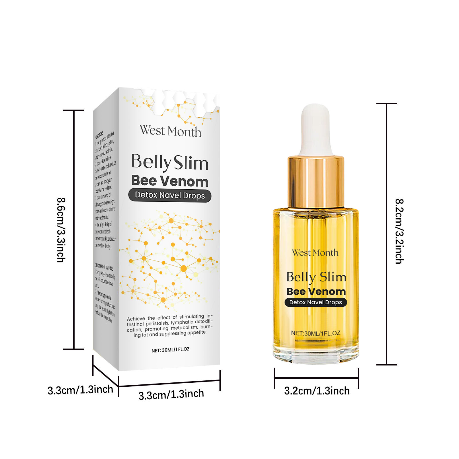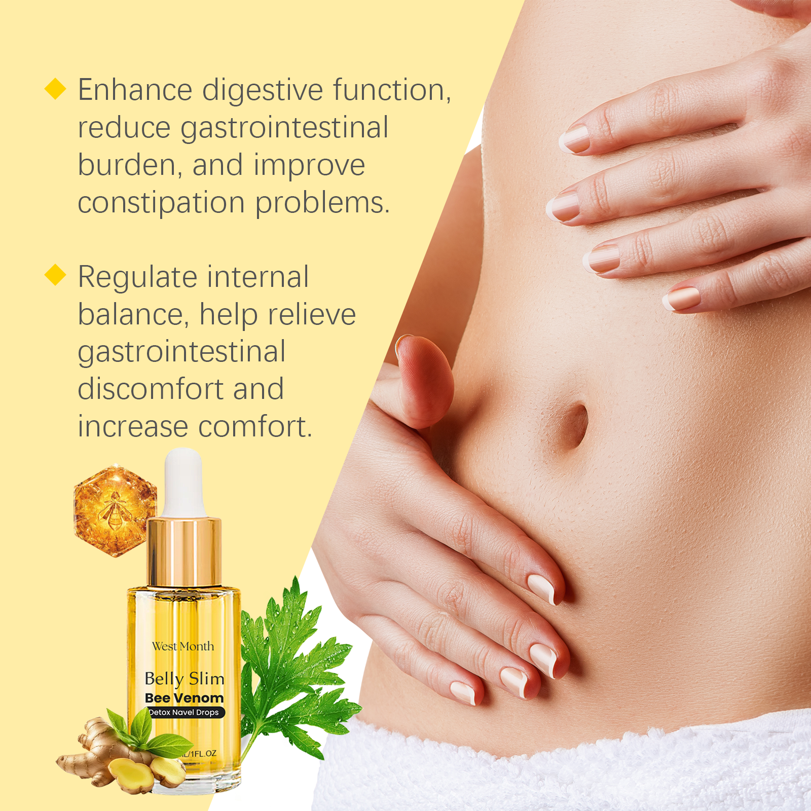 Our bee venom body care essence is carefully formulated with glycerin and hydroxyethyl cellulose. Designed specifically for rapid absorption to help you quickly feel your body light. The usage method is extremely convenient: Thoroughly clean and dry the skin around the navel. Take an appropriate amount of this product and drop it onto the navel, then wait for it to be absorbed. It can also enhance digestive function, reduce the burden on the stomach and intestines, and improve constipation problems.