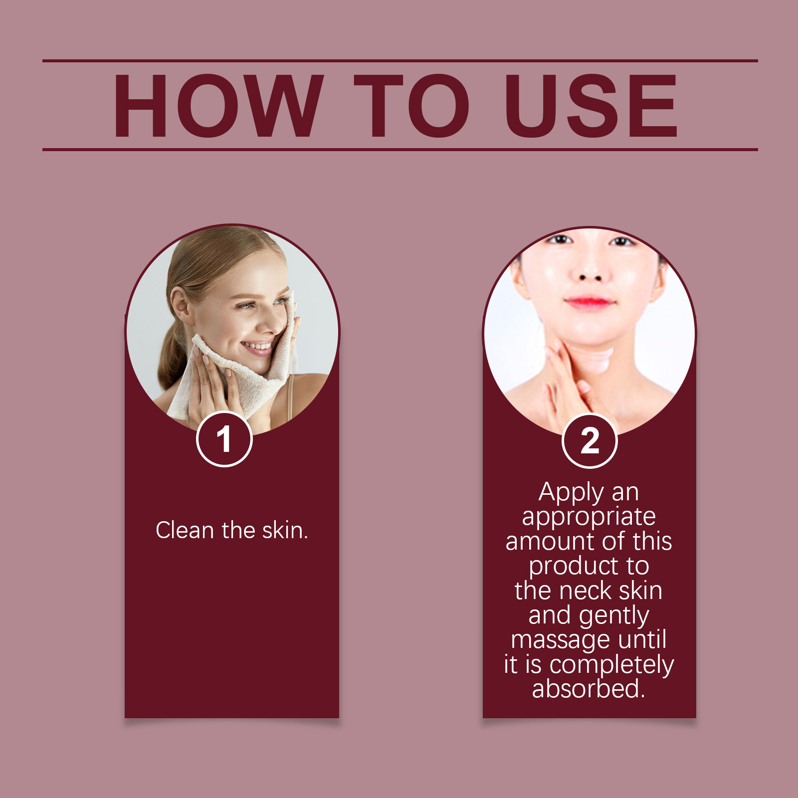 Our firming neck cream contains glycerin, glycerin stearate. It helps to hydrate deep skin; Keep the moisture locked in. Improves skin elasticity and creates a tight neck contour. The way to use it is simple: clean the skin. Apply appropriate amount to neck skin and gently massage until completely absorbed. It also moisturizes for a long time, keeping skin moist and soft, and resisting the effects of dry environments.