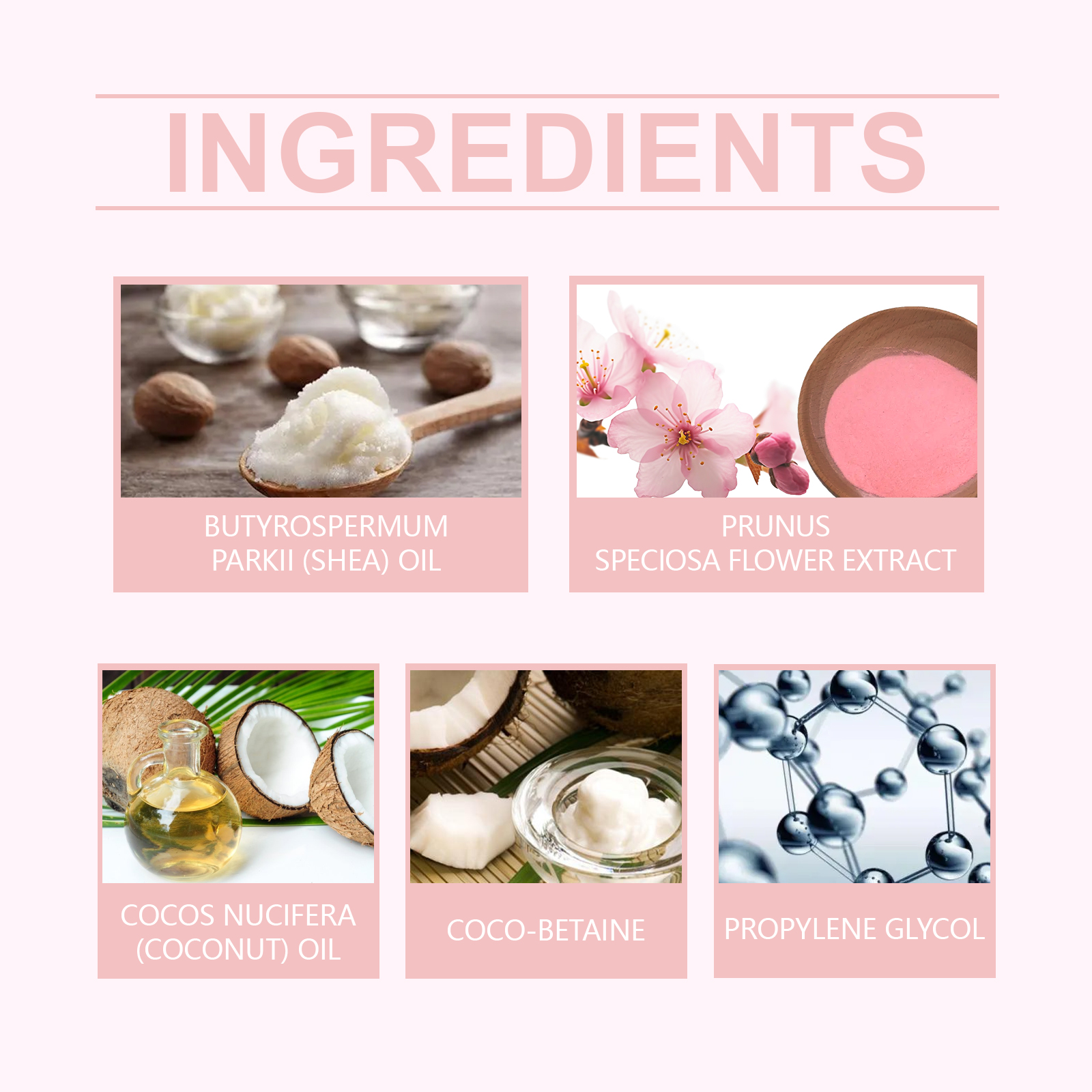 Our cherry blossom Moisturizing body wash contains shea butter, cherry blossom extract and coconut oil. It can repair and strengthen the skin barrier, restore skin softness and elasticity. Its use method is very simple: 1. Moisturize the body skin with warm water; 2. Take proper amount of body wash and lather it into foam, and evenly apply it to the whole body; 3. Gently massage until completely clean and finally rinse with water. Effectively lock skin moisture, prevent skin tightness after bathing, give skin long-term moisturizing effect, keep skin soft and smooth.