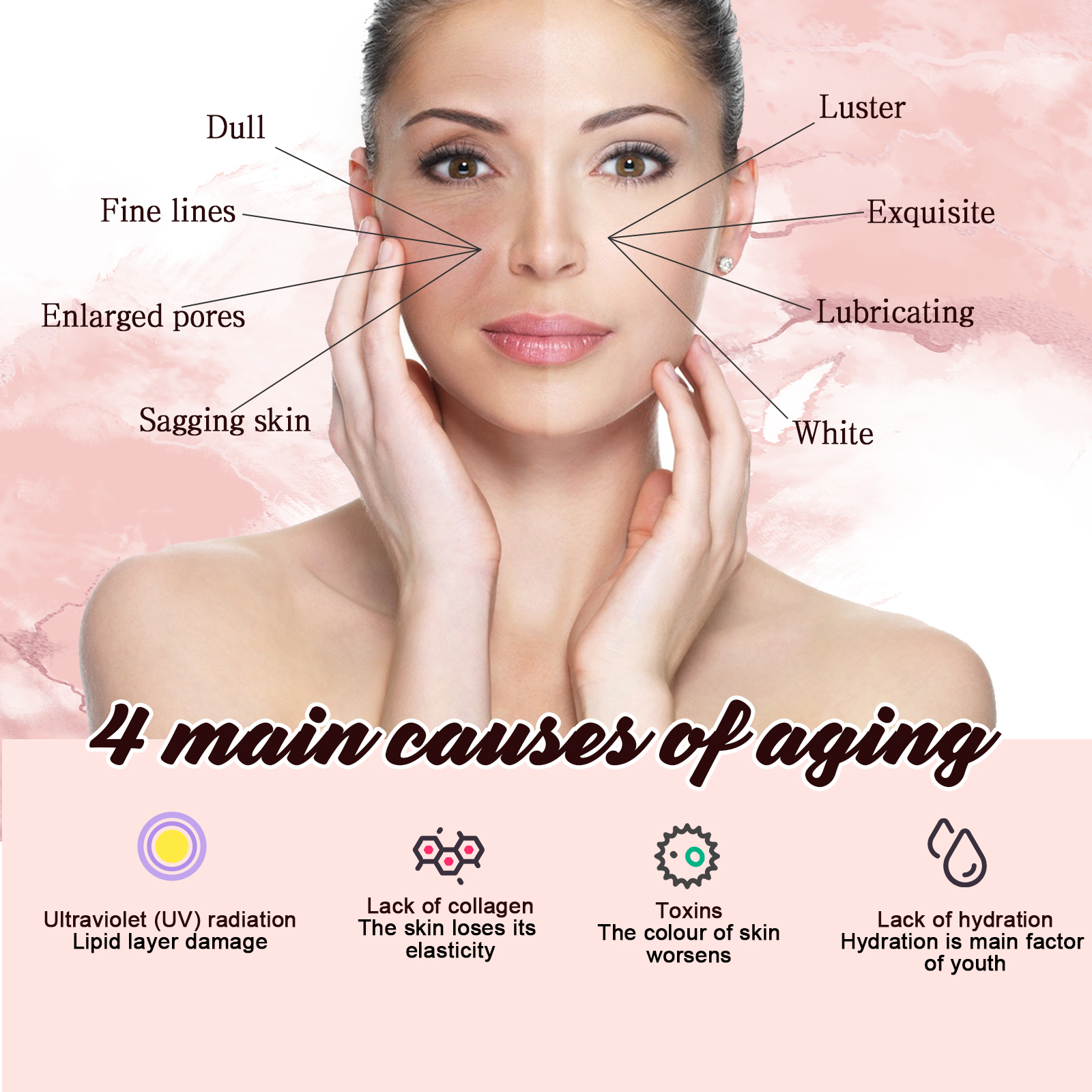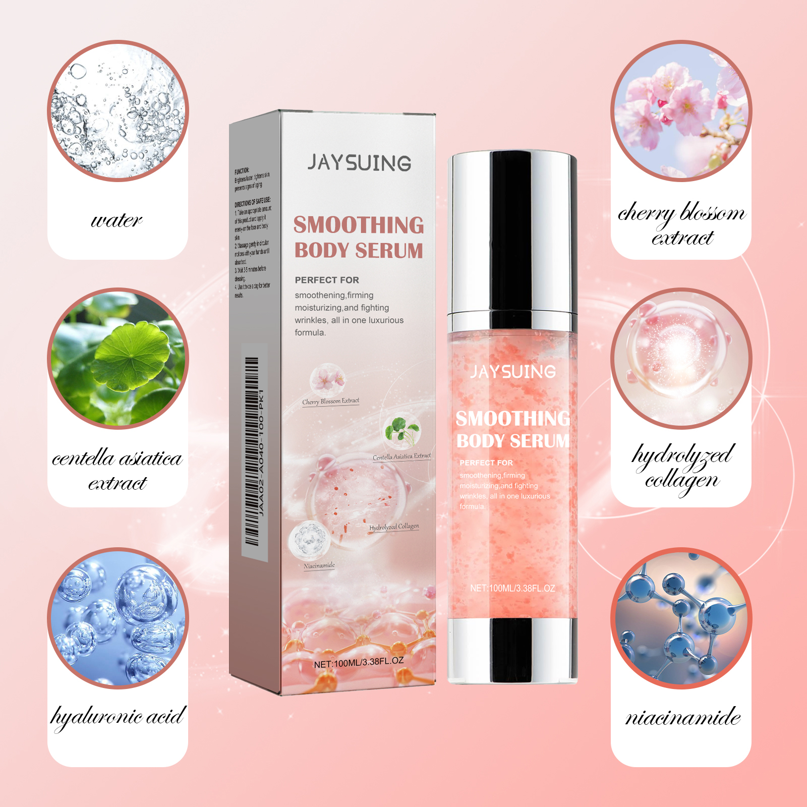 Our Smoothing body essence contains cherry blossom extract, Centella asiatica extract and hydrolyzed collagen. It has a constitution that can easily darken and is hard to turn white again. The skin starts to wrinkle, becomes loose and loses collagen. Dry skin exposed to the sun for a long time without timely care becomes dry and flaky. If the pores are not cleaned properly, dirt will accumulate, leading to enlarged pores and rough skin. Its usage is very simple: Take an appropriate amount of this product and apply it evenly to the face and all over the body. Gently massage in circular motions with your hands until it is absorbed. Wait for 3 to 5 minutes before wearing clothes. It works better to use it twice a day. Skin armpit whitening, moisturizing to relieve dryness, fresh and lustrous, hydrated and plump, deeply penetrating the skin, reducing wrinkles and skin wrinkling.