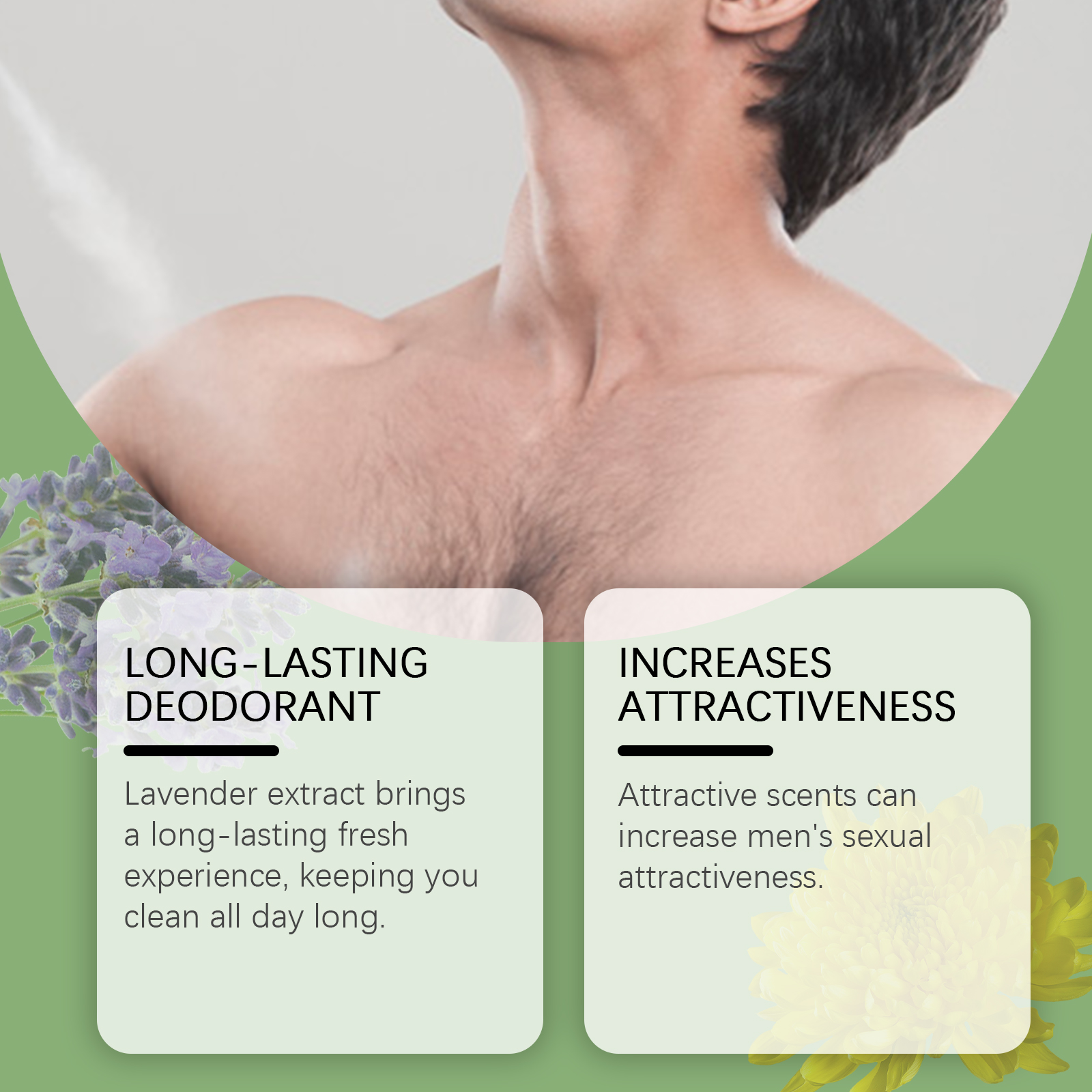 Our men's freshening spray contains lavender extract, chrysanthemum extract, Hypericum perforatum extract. It will smell fresh and deodorize for a long time. Soothe skin and reduce irritation. Suppress the smell and keep it fresh. The way to use it is simple: 1. Clean and dry the underarm area before use. 2. Gently shake the spray bottle, hold the spray bottle about 10-15 cm from the armpit, and evenly spray the appropriate amount of product. 3. Gently massage the underarm area with your hands to allow the skin to absorb. Lavender essence delivers a long-lasting refreshing experience that will keep you clean throughout the day. Attractive smells can increase a man's sexual attraction.