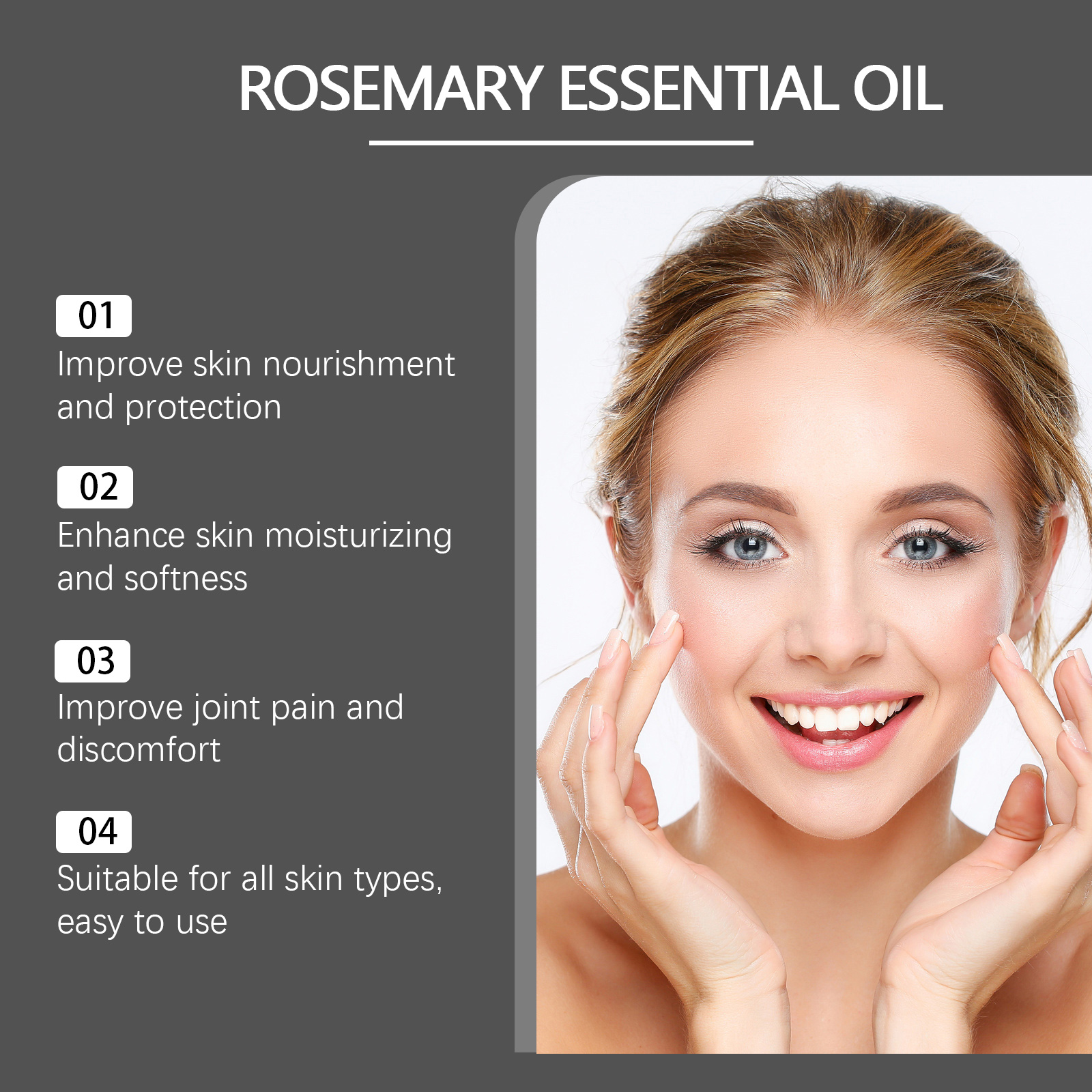 Our rosemary essential oil contains rosemary leaf oil, cedar bark extract, sage leaf extract. It can improve dry and rough skin. Keep your skin young. Leave no greasy feeling. Maintain the skin barrier. Smooth dry fine lines easily. Its use method is very simple: 1. Clean the body skin, keep dry; 2. Apply appropriate amount of this product evenly to knees, feet, shoulders, elbows and other joints. 3. Gently massage until completely absorbed. Soothe your emotions and relax your body and mind. Quickly absorbed, leaving no greasy feeling.