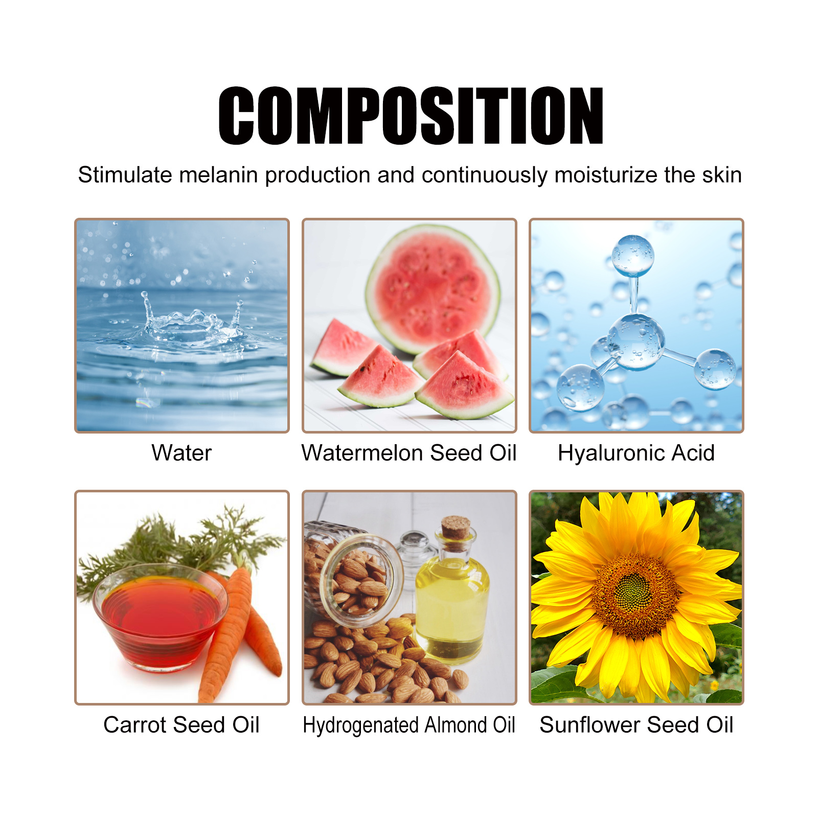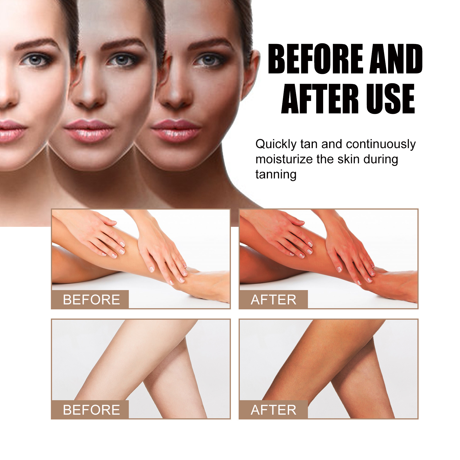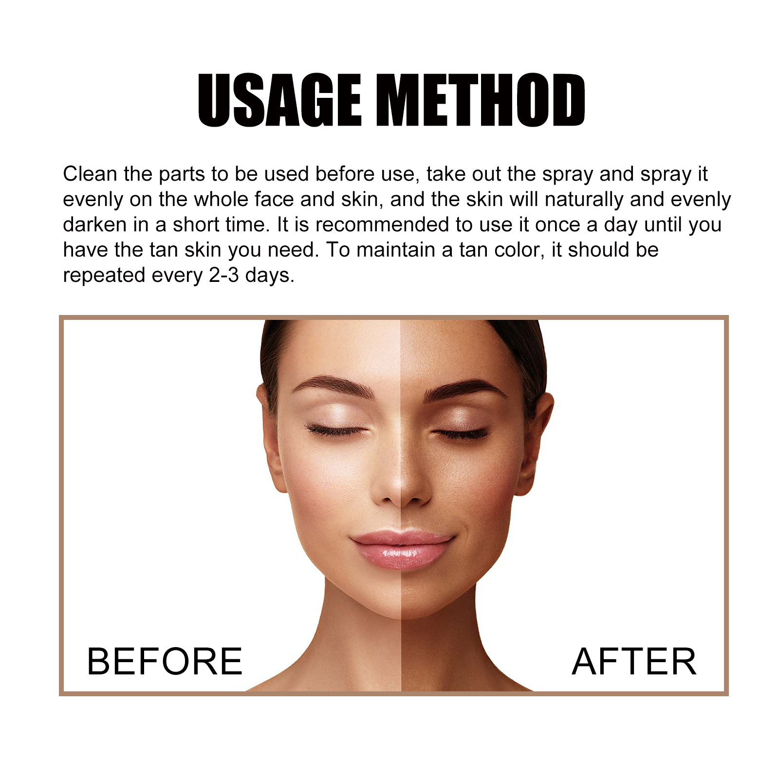 Our blackening spray contains watermelon seed oil, hyaluronic acid and carrot seed oil. It helps you tan quickly while continuing to moisturize your skin during the tanning process, providing deep, rich, radiant tanned skin. Its application method is very simple: first clean the area that will be used before use, then take out the spray and spray evenly on the whole face and skin, and the skin is naturally and evenly darkened in a short time. It is recommended to use once a day until you have the desired tan, moisturize and reduce wrinkles after use, obtain an even tanning effect, prevent skin aging caused by light, and give you beautiful black skin.