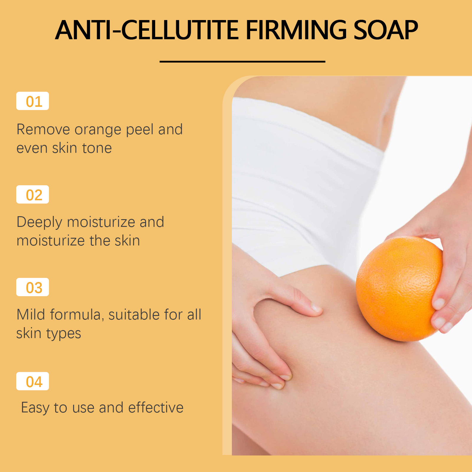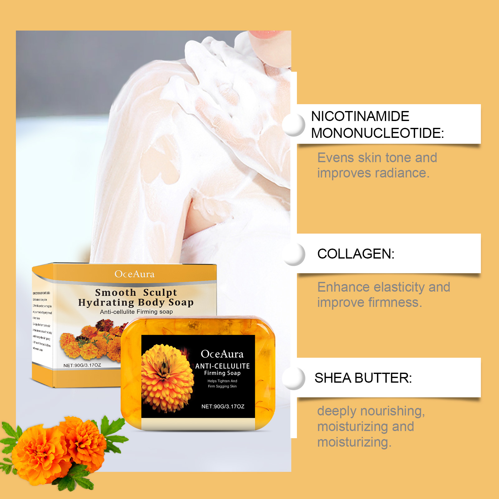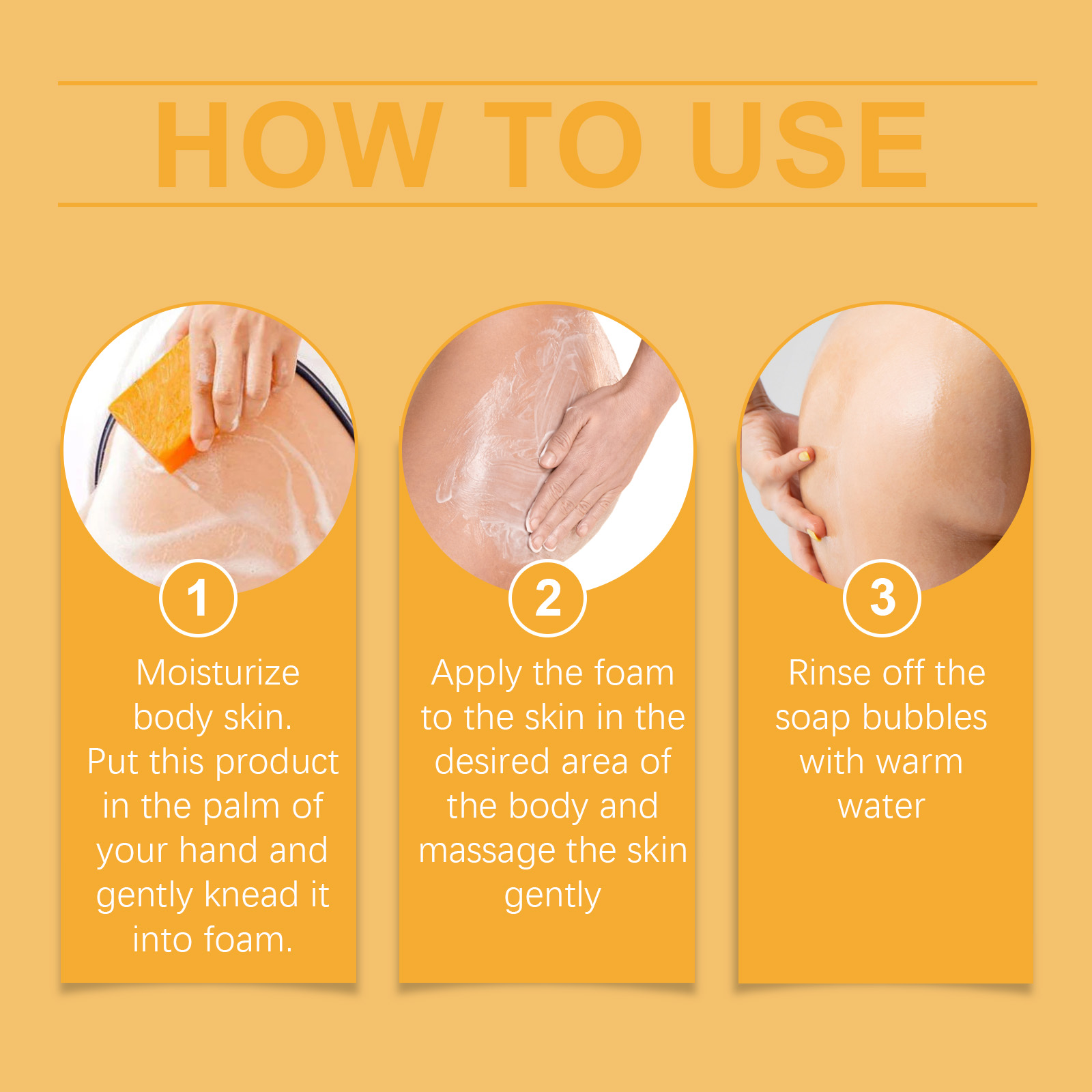 Our orange peel moisturizing body soap contains niacinamide mononucleotide, collagen, shea butter. It can even out skin tone and improve skin luster. Enhance elasticity and improve firmness. Deep nourishing and moisturizing. Its application method is very simple: 1. Moisturize the body skin. Place this product in the palm of your hand and gently lather it. 2. Apply the foam to the desired parts of the body and gently massage; 3. Rinse off the soap foam with warm water. Provides long-lasting moisture and leaves skin soft and smooth. Mild formula, suitable for all skin types, non-irritating.