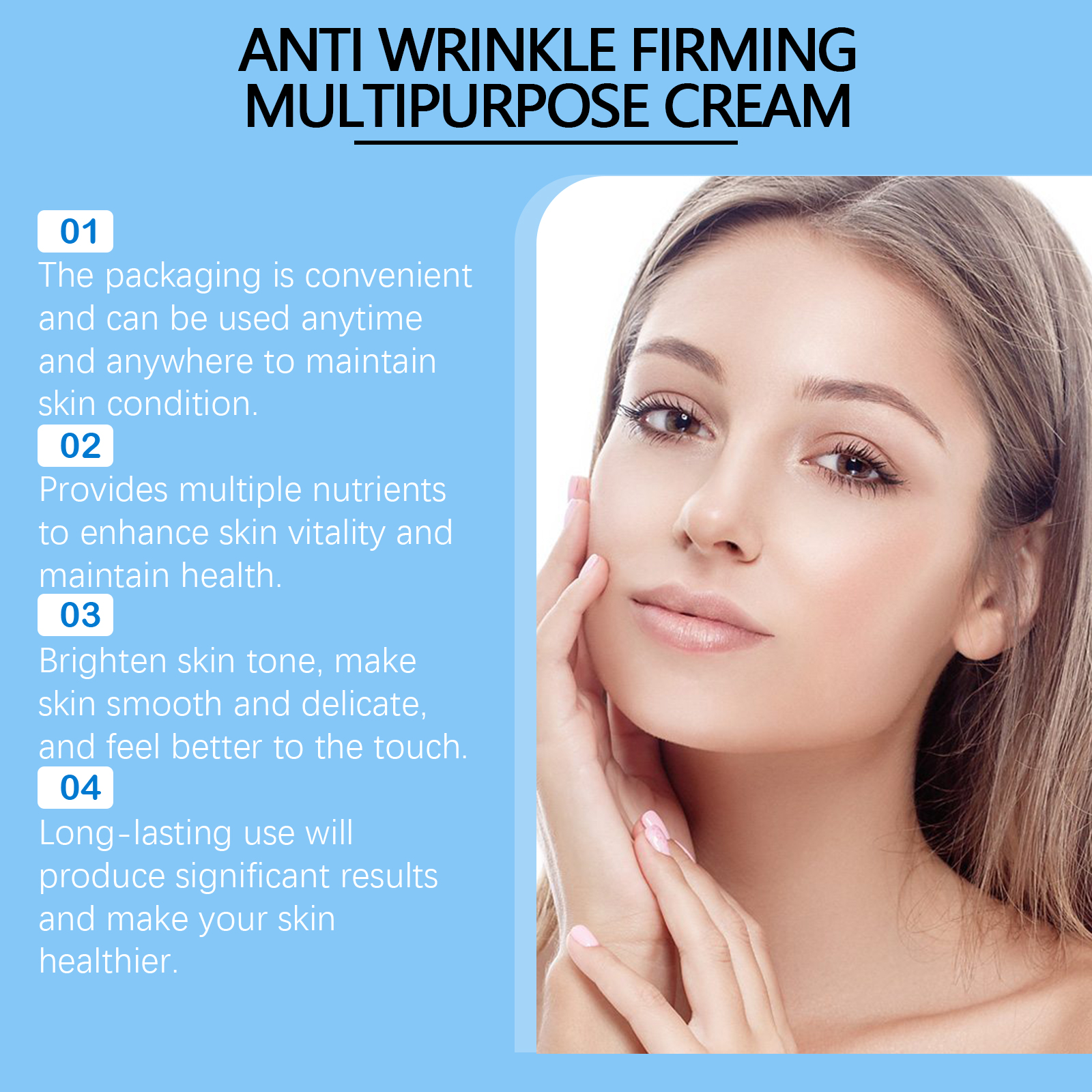 Our firming and moisturizing moisturizer contains mineral oil, glycerin stearate, carbomer. It can effectively improve skin firmness and reduce fine lines. Provides deep moisturizing effect and keeps skin moisturized. Its application method is very simple: 1. Clean skin, keep dry; 2. Apply appropriate amount of this product evenly on neck and legs. Abdomen, arms or any desired area; 3. Gently massage in circular motions to fully absorb. Resist the damage of the external environment to the skin, keep the skin youthful.