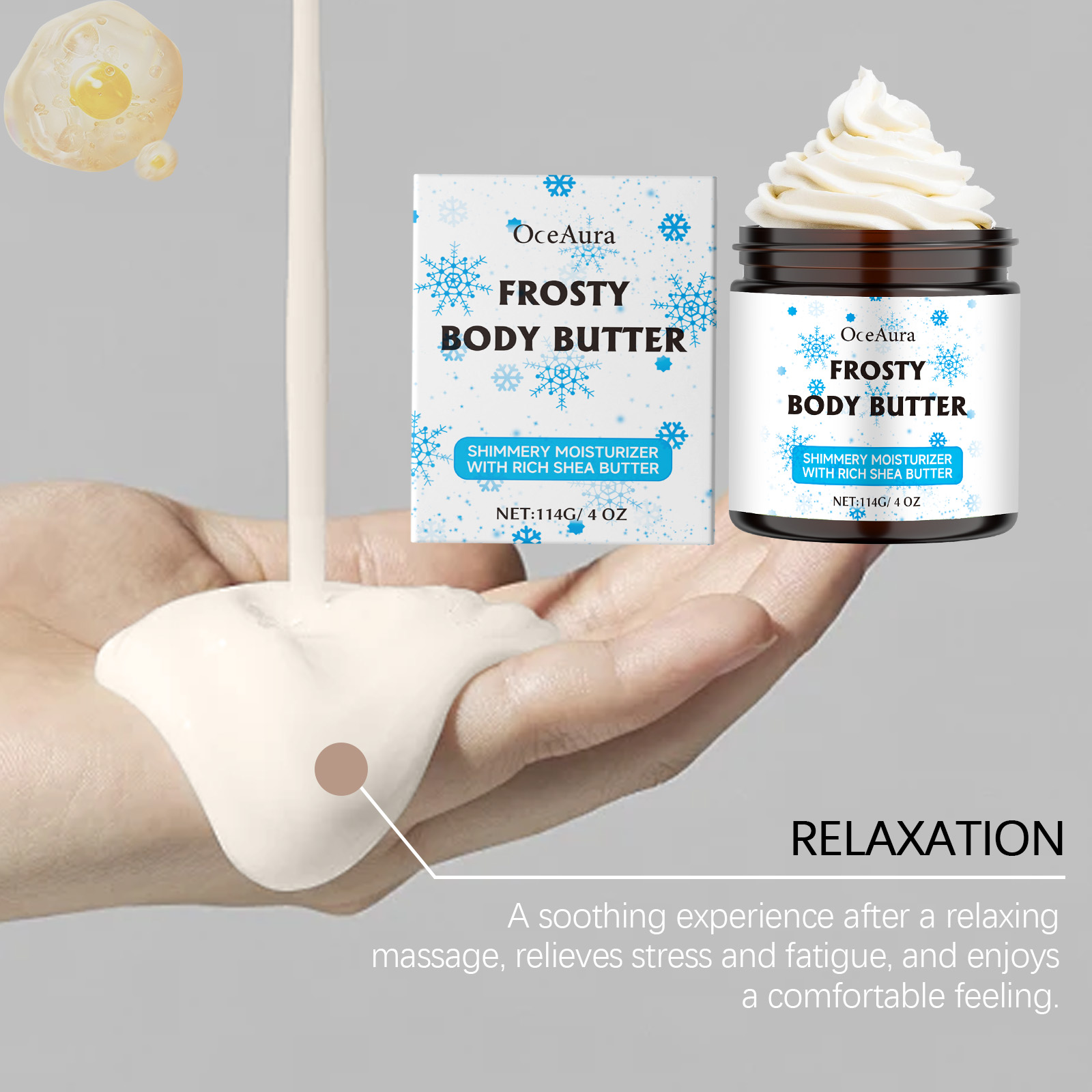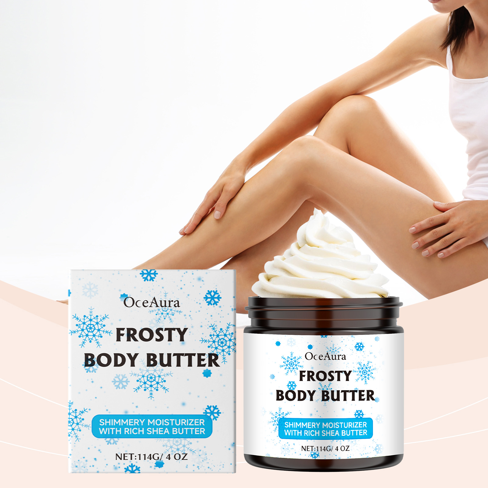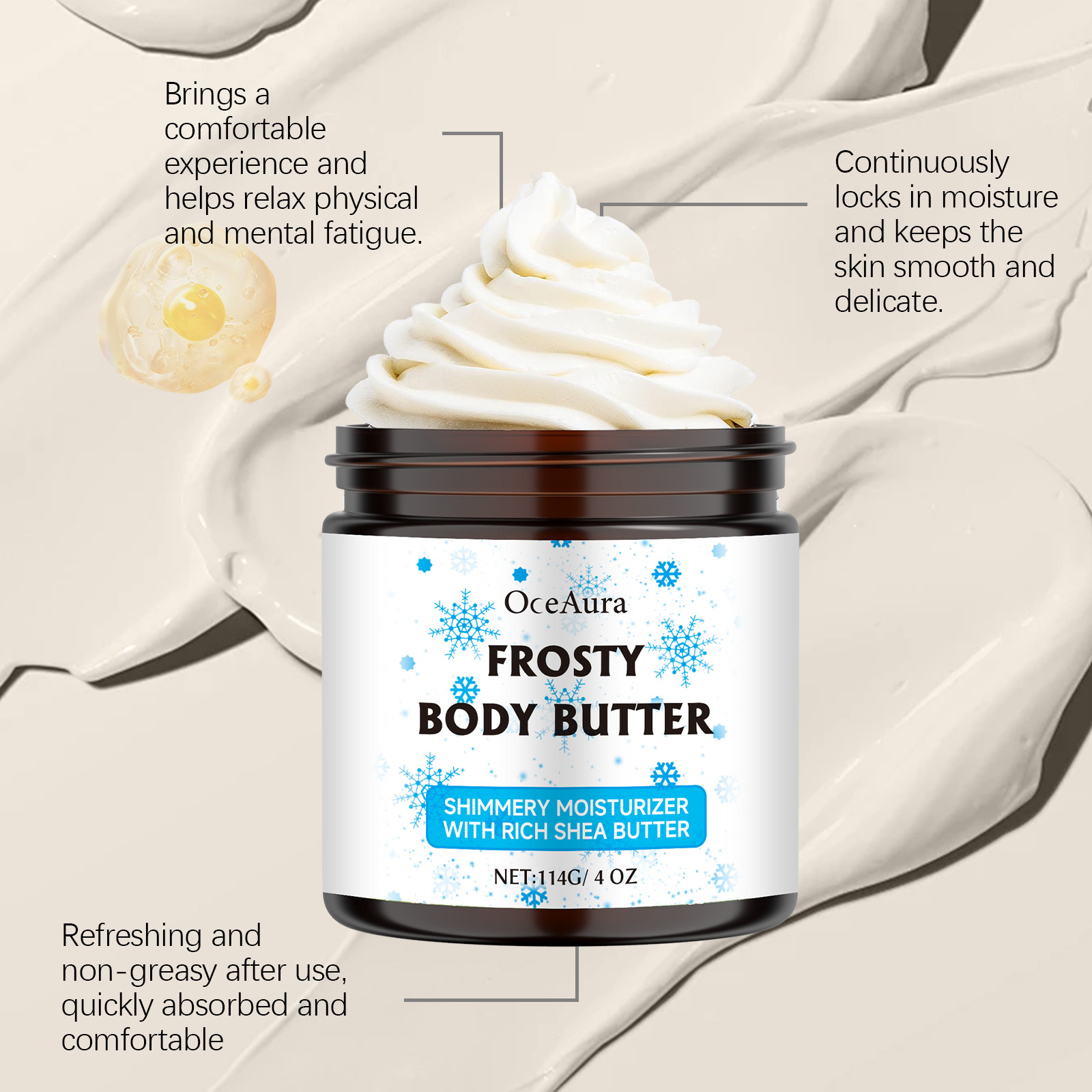 Our shea butter moisturizer contains shea butter, Jojoba seed oil, collagen. It can help improve skin moisture, lock in moisture for a long time, and keep skin soft and smooth. Its application method is simple: 1. Thoroughly clean and dry the skin; 2. Apply appropriate amount of the product evenly on the neck, legs, abdomen, arms and other parts of the body; 3. Massage gently to promote better absorption. Gently moisturizes the skin, suitable for daily use all over the body.
