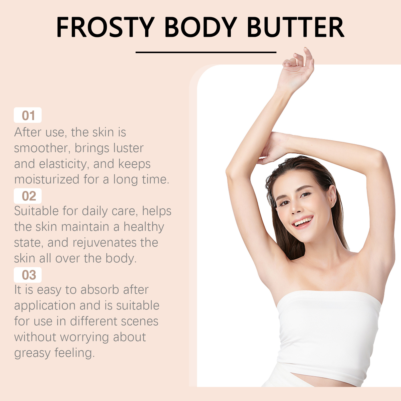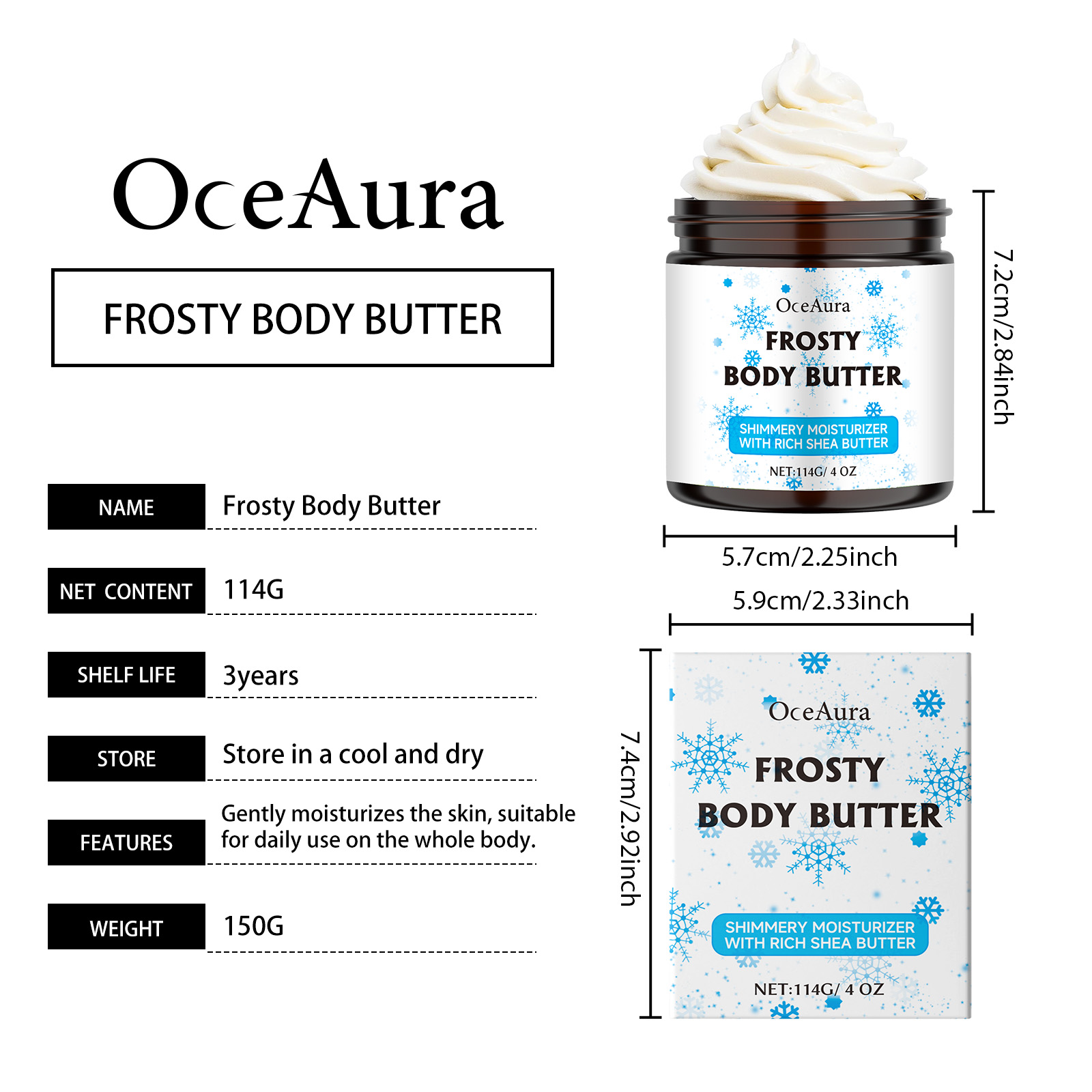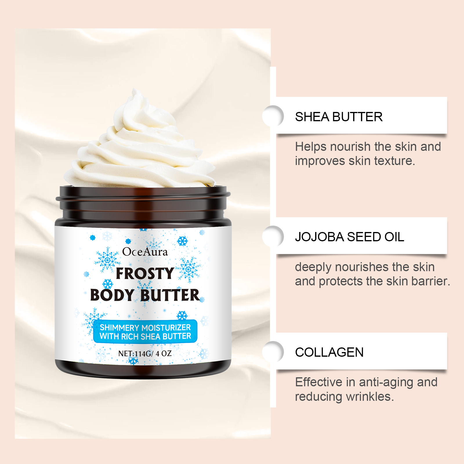 Our shea butter moisturizer contains shea butter, Jojoba seed oil, collagen. It can help improve skin moisture, lock in moisture for a long time, and keep skin soft and smooth. Its application method is simple: 1. Thoroughly clean and dry the skin; 2. Apply appropriate amount of the product evenly on the neck, legs, abdomen, arms and other parts of the body; 3. Massage gently to promote better absorption. Gently moisturizes the skin, suitable for daily use all over the body.