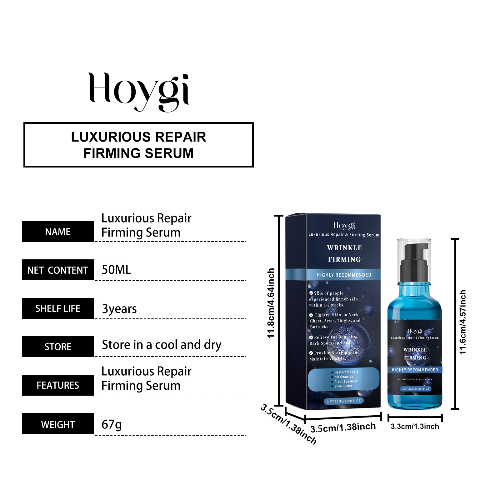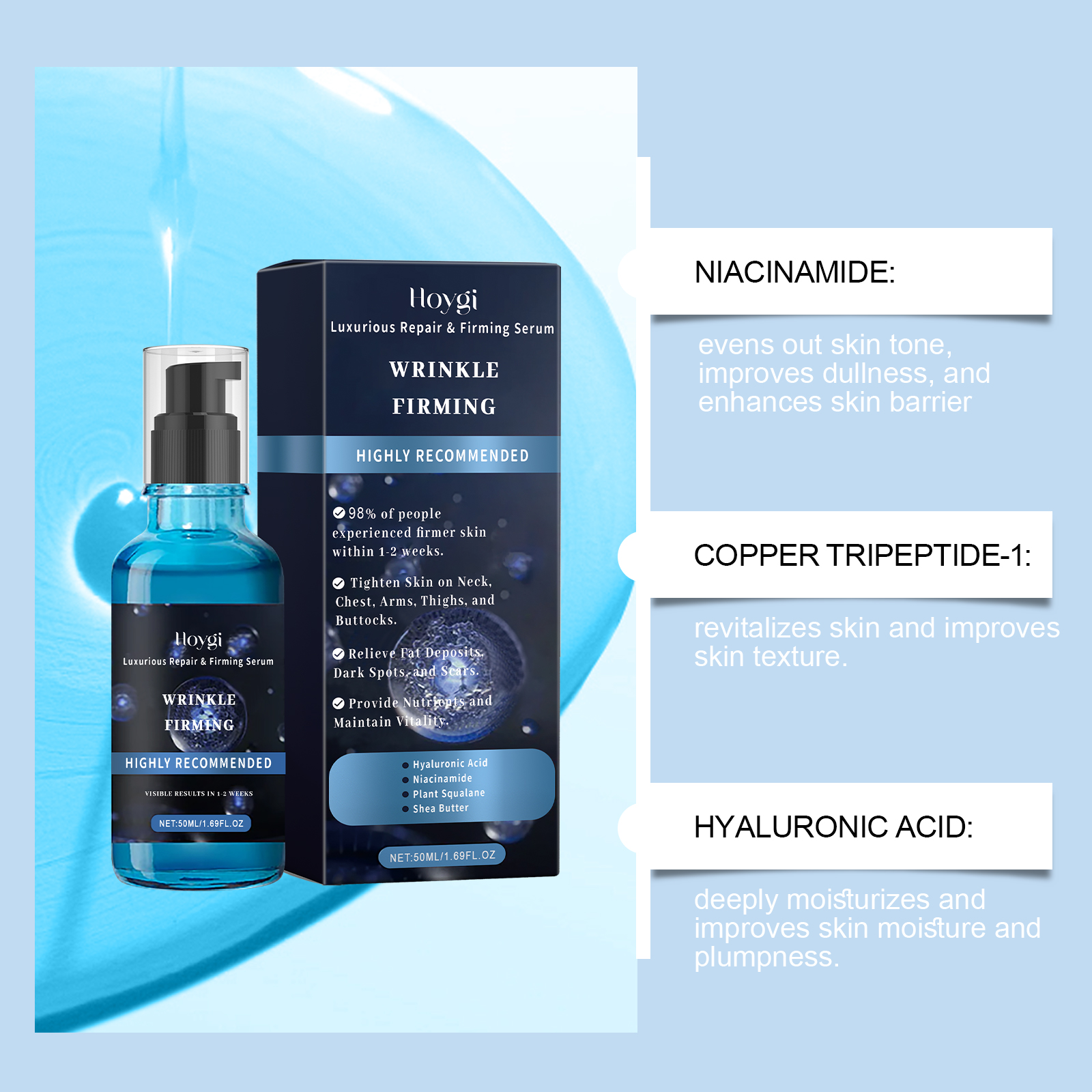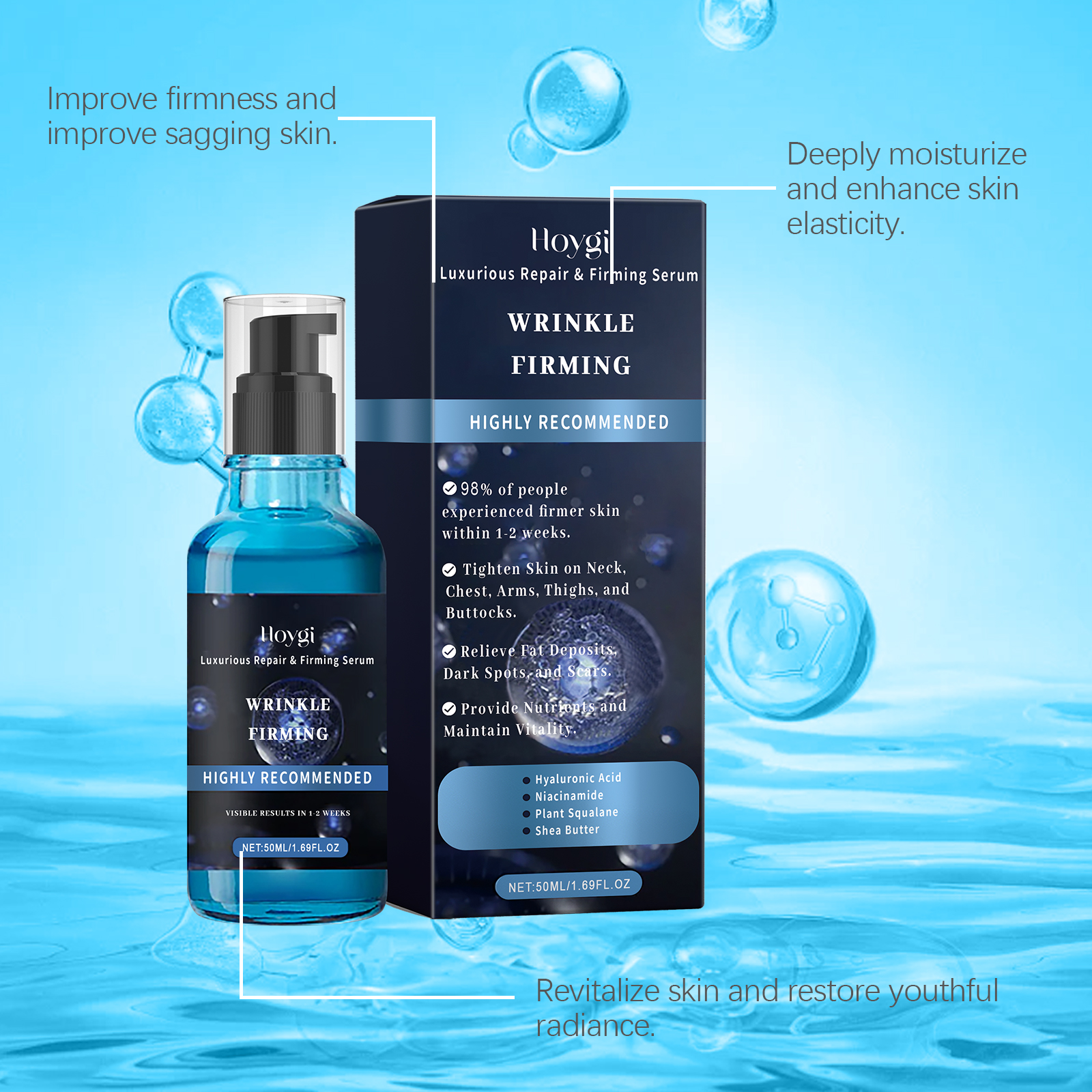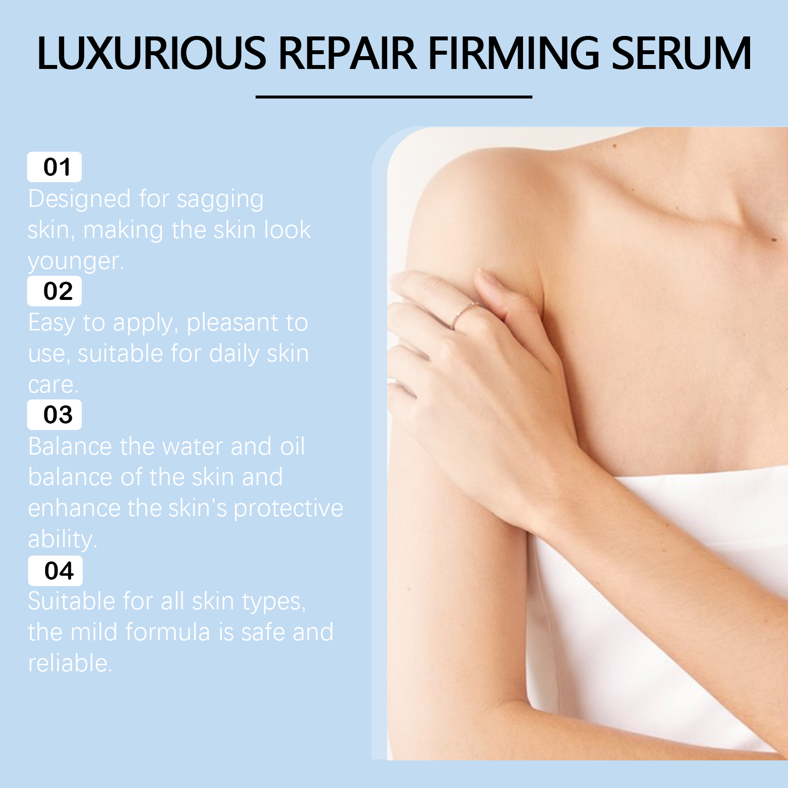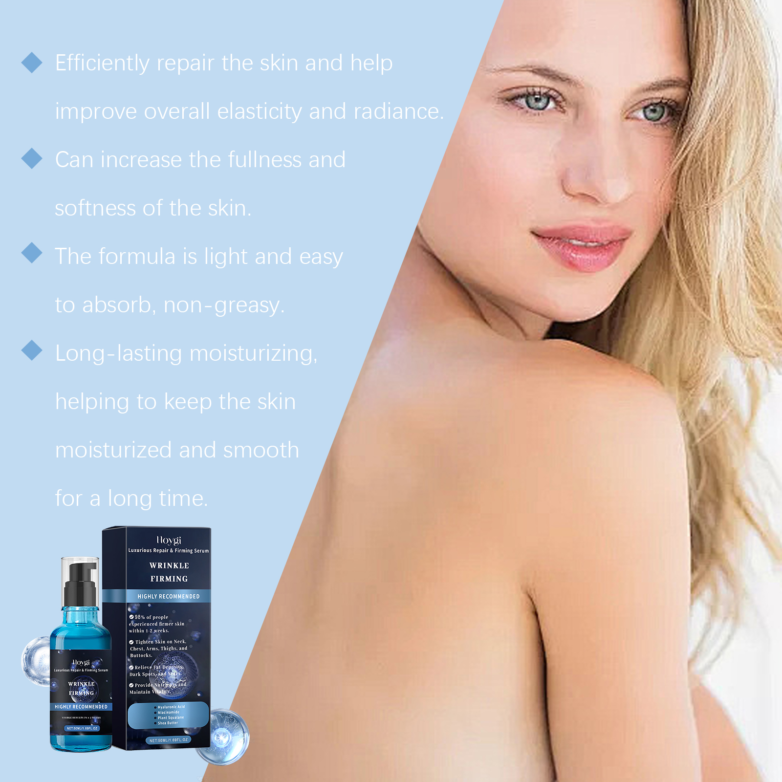 Our body care serum contains niacinamide, copper tripeptide-1, phytosqualane. It can help tighten loose skin to restore firmness and boost confidence. Its application method is very simple: take a proper amount of this product and evenly apply it to the skin of the face, arms, abdomen and thighs. Gently massage until fully absorbed. It can provide deep nourishment for the skin and keep the skin moist and tender.