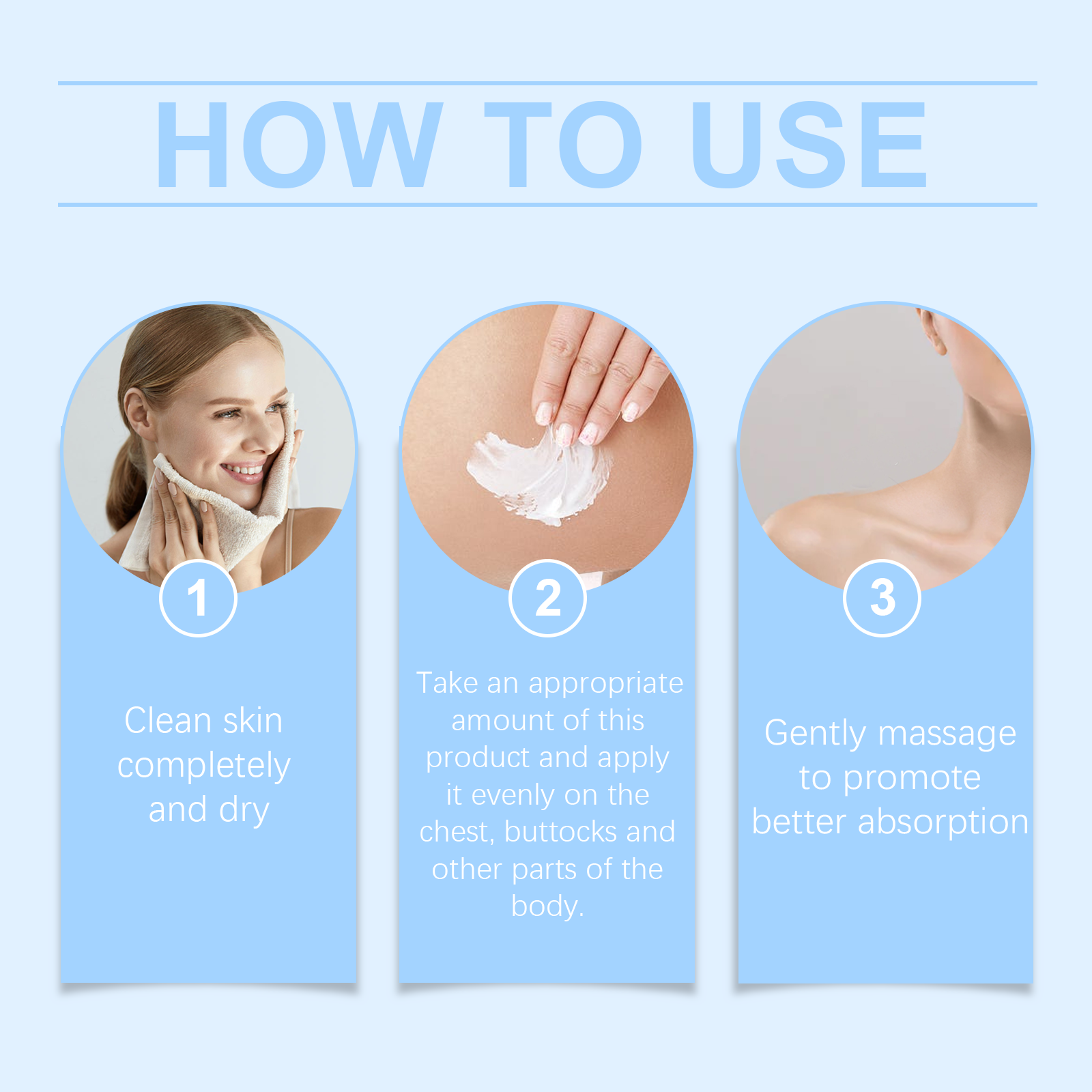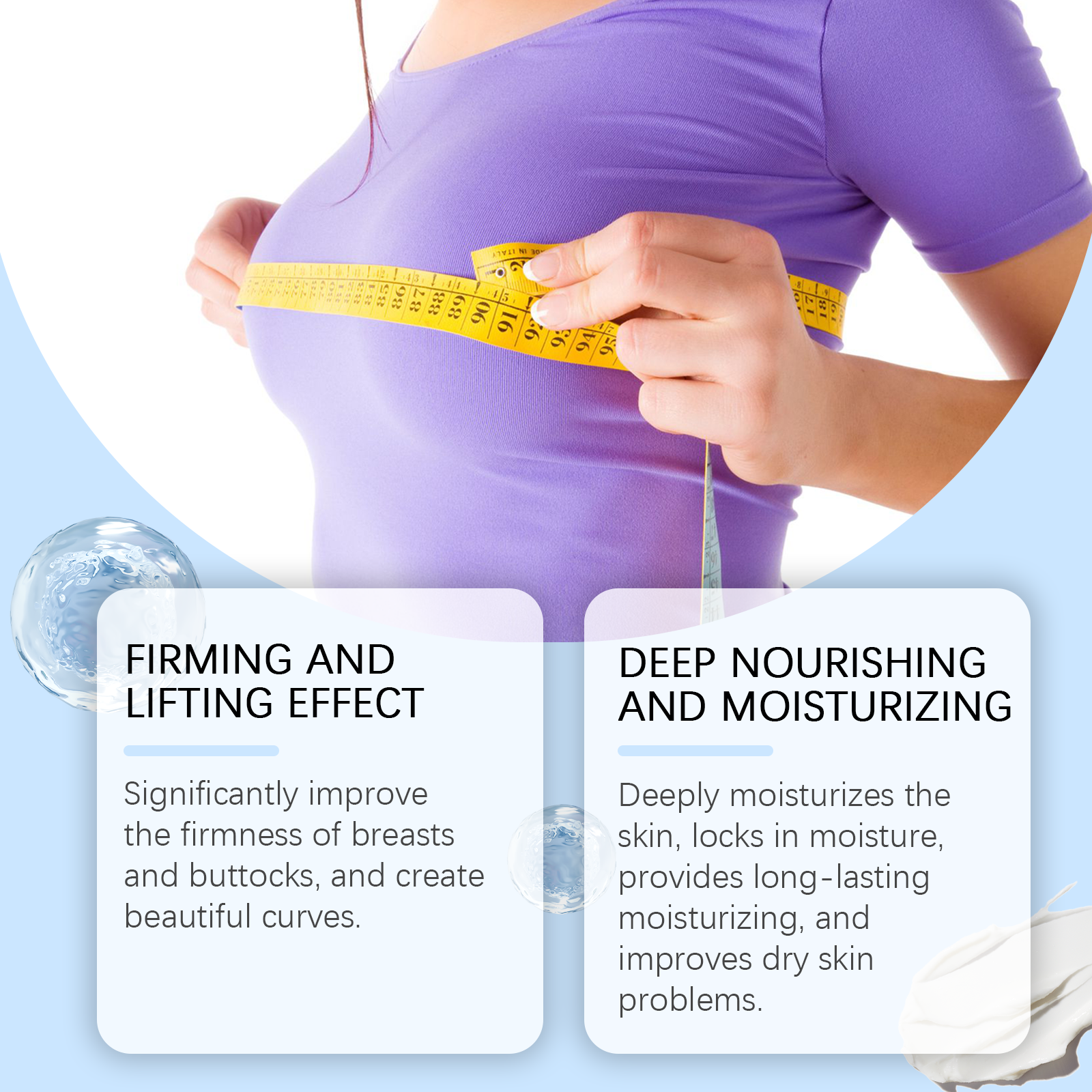 Our Collagen body cream contains collagen, glycerin, and turmeric root extract. It can significantly improve the firmness of the chest and buttocks and create beautiful curves. Its application method is simple: 1. Thoroughly clean and dry the skin; 2. Apply appropriate amount of this product evenly to the chest, buttocks and other parts of the body. 3. Massage gently to promote better absorption. Deeply moisturize the skin, lock in moisture, provide lasting moisture, and improve dry skin problems.