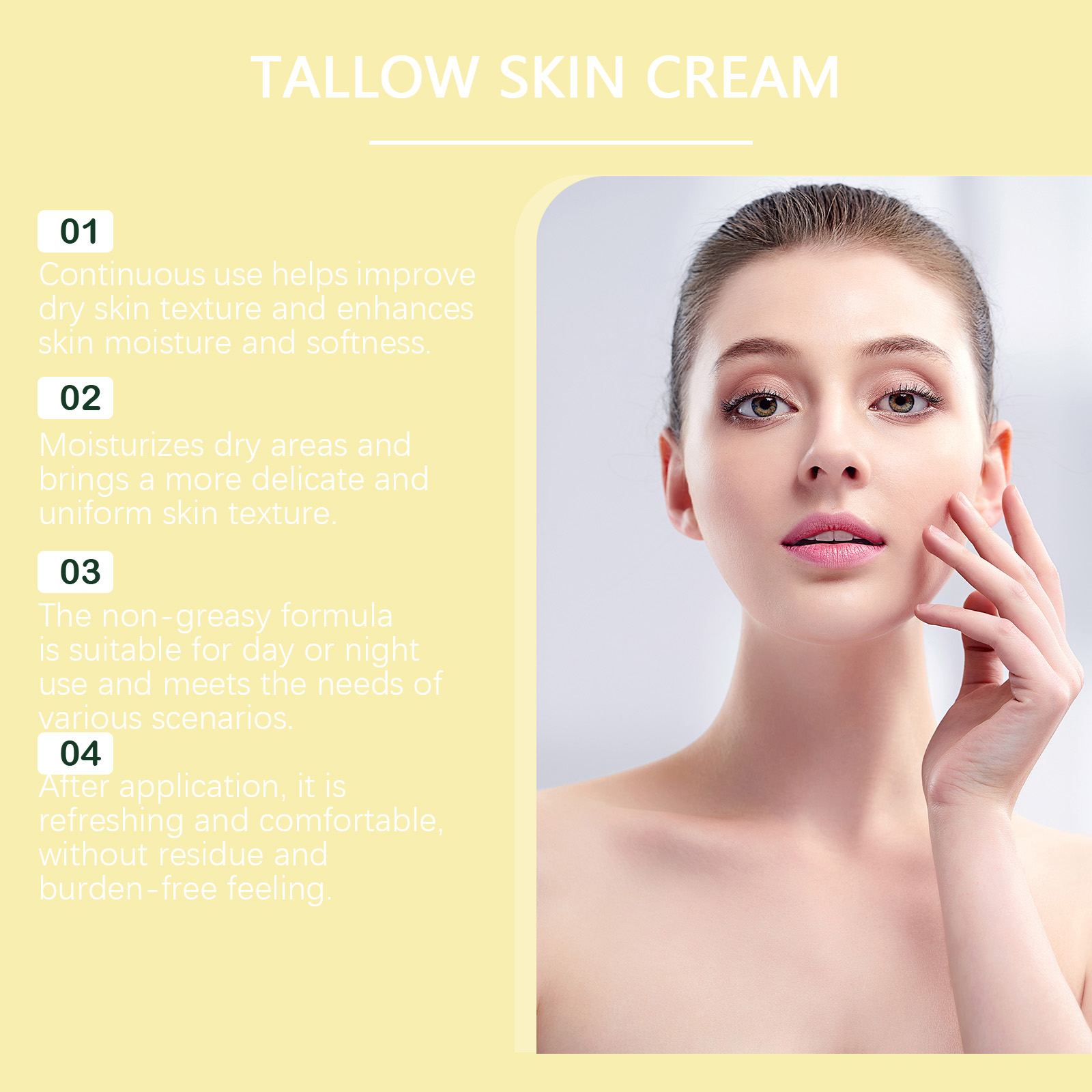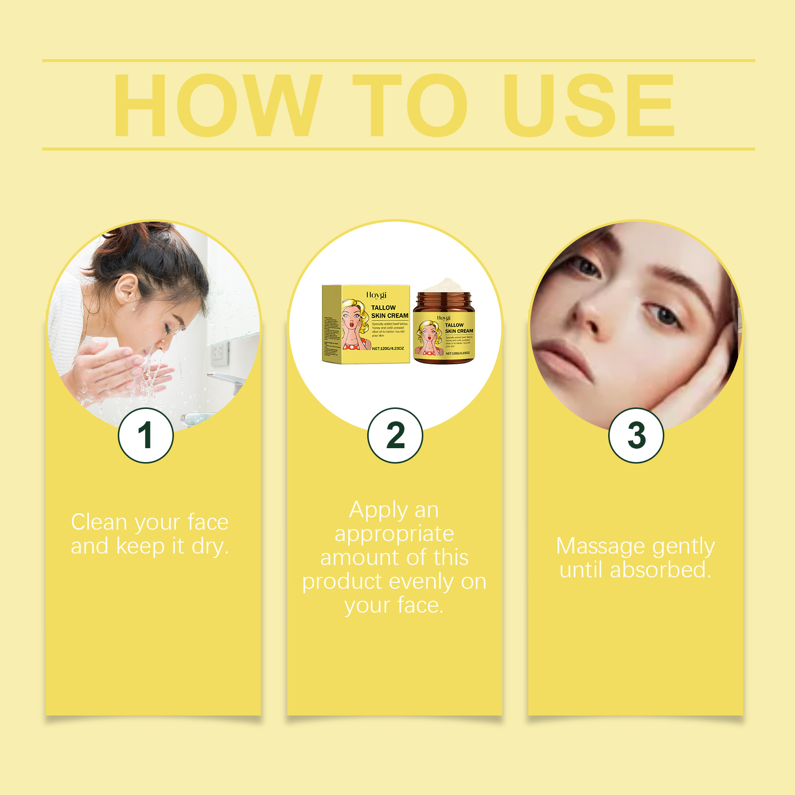 Our tallow honey moisturizer contains olive oil, tallow and honey. It penetrates the surface of the skin to help relieve dryness and keep skin hydrated. The way to use it is simple: clean your face and keep it dry. Apply appropriate amount to face evenly. Massage gently until absorbed. And the use of mild formula design, relieve skin discomfort, bring a relaxed and pleasant experience.