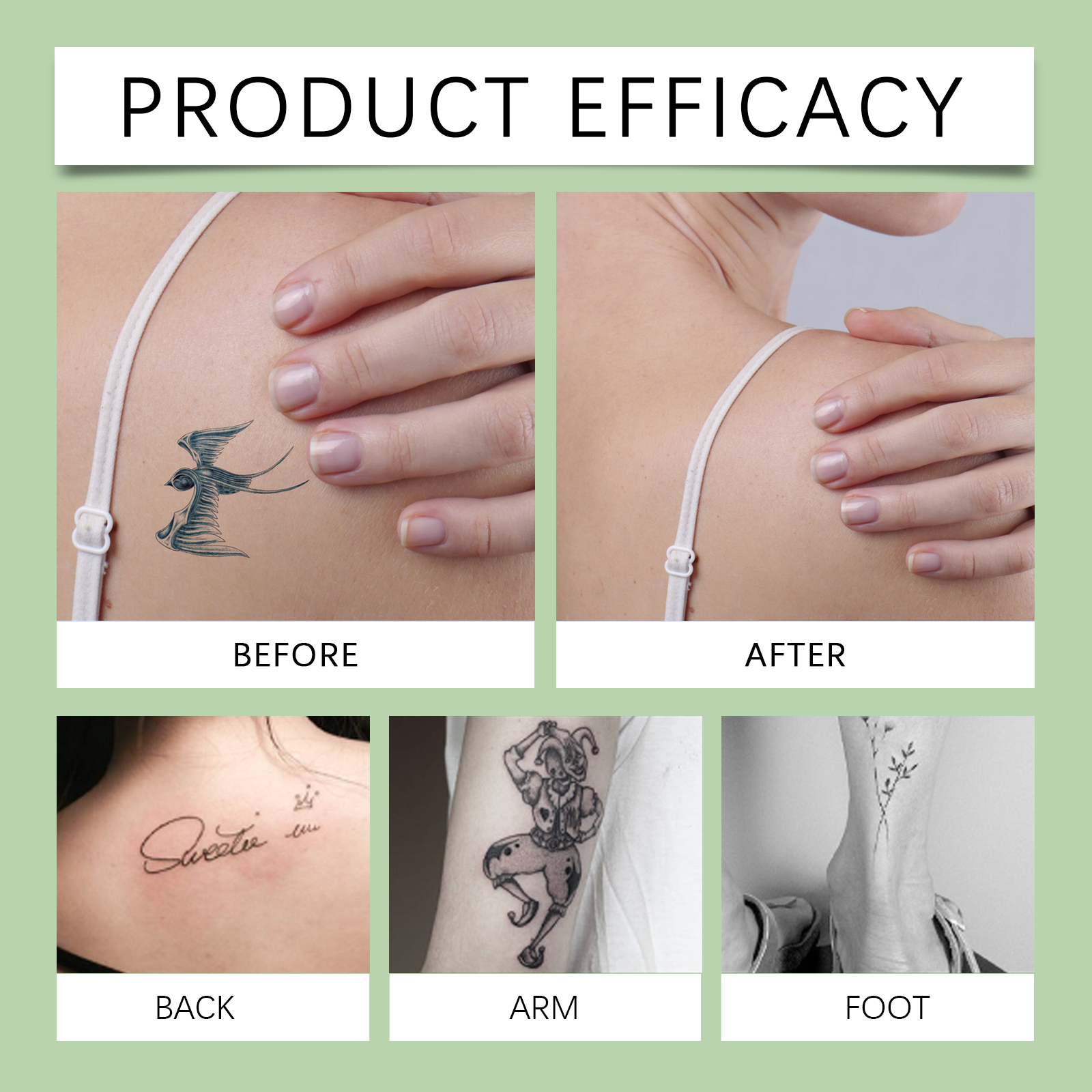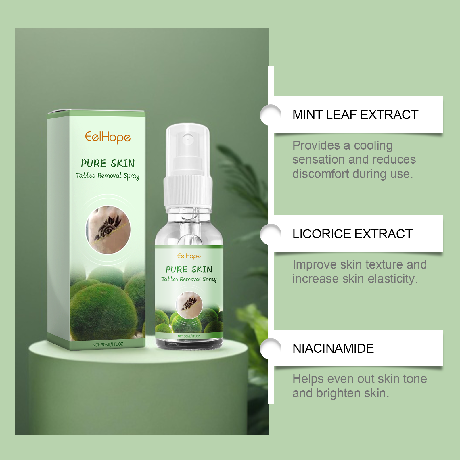 Our tattoo cleaning spray is carefully formulated with niacinamide and glycerin. Designed specifically to effectively fade the color of tattoos. The usage method is extremely convenient: Clean the skin area where the tattoo is located, evenly spray an appropriate amount of this product onto the tattoo site, and gently pat until it is fully absorbed. And after use, it can relieve skin discomfort after application.