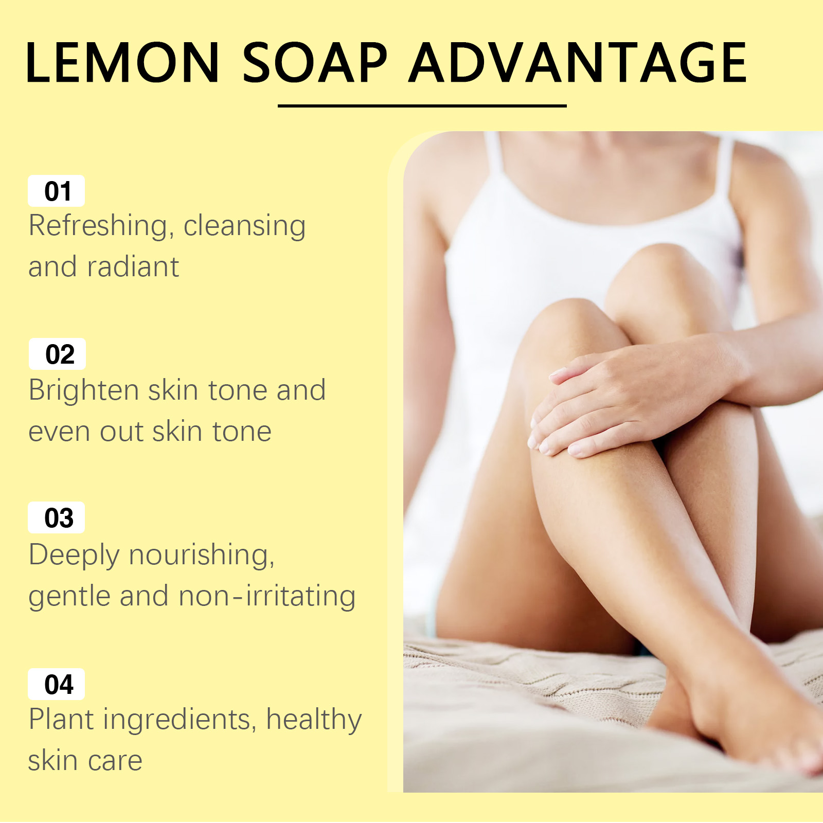 Our lemon herbal vitamin C soap is carefully blended from shea butter, lemon oil and tea tree oil. Designed specifically for deeply nourishing the skin and keeping it hydrated and smooth. The usage method is extremely convenient: First, use clean water to create foam with the soap, then apply it to the skin and massage for 1 minute. Finally, rinse it off with clean water. It can effectively remove dirt and oil, keep the skin fresh and clean, and help brighten and even out the skin tone.
