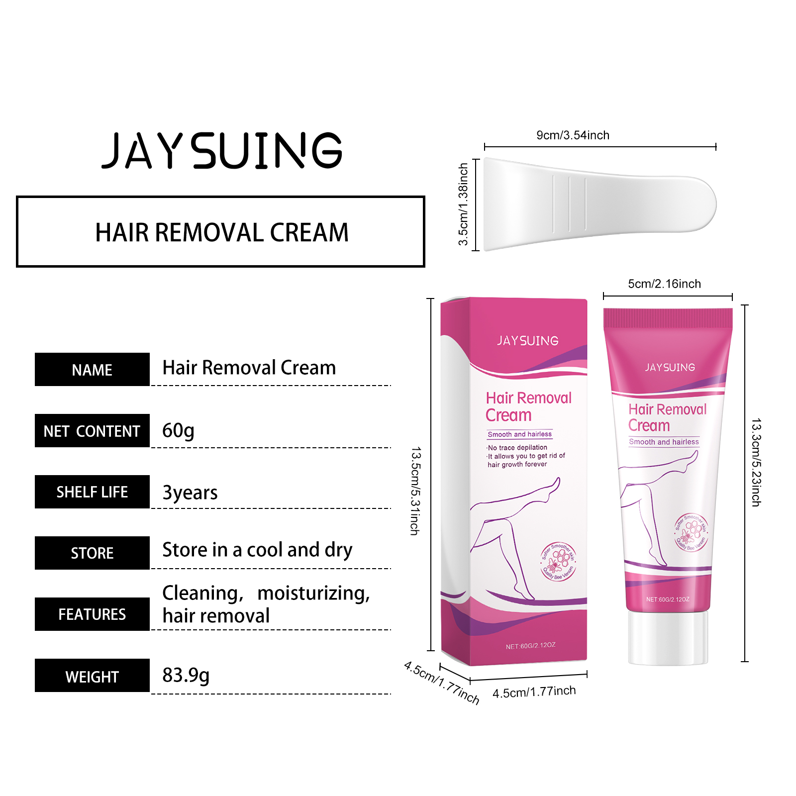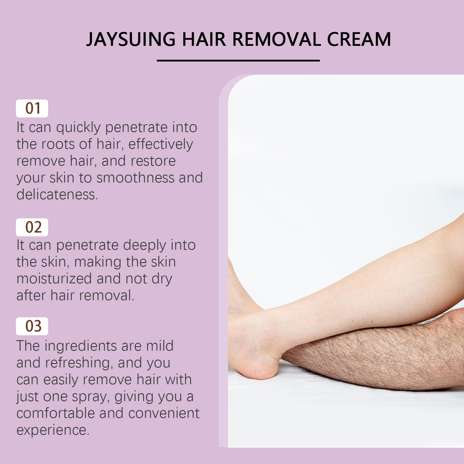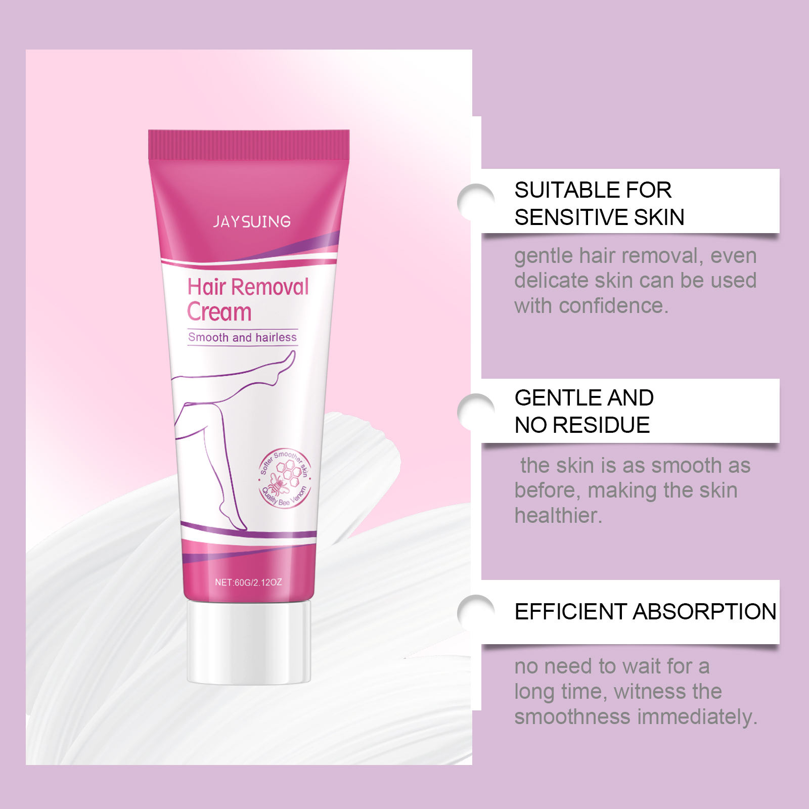 Our body hair removal cream contains glycerin and Asiaticum extract. It can promote skin health and strengthen skin texture. Its application is simple: clean the skin, keep it dry, apply an appropriate amount of this product evenly to the area that needs to be removed, wait 10-15 minutes to remove the residue with the included scraper, and then rinse the hair. And can reduce irritation, suitable for sensitive skin.