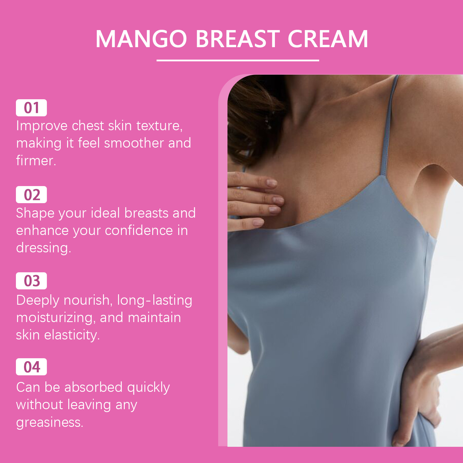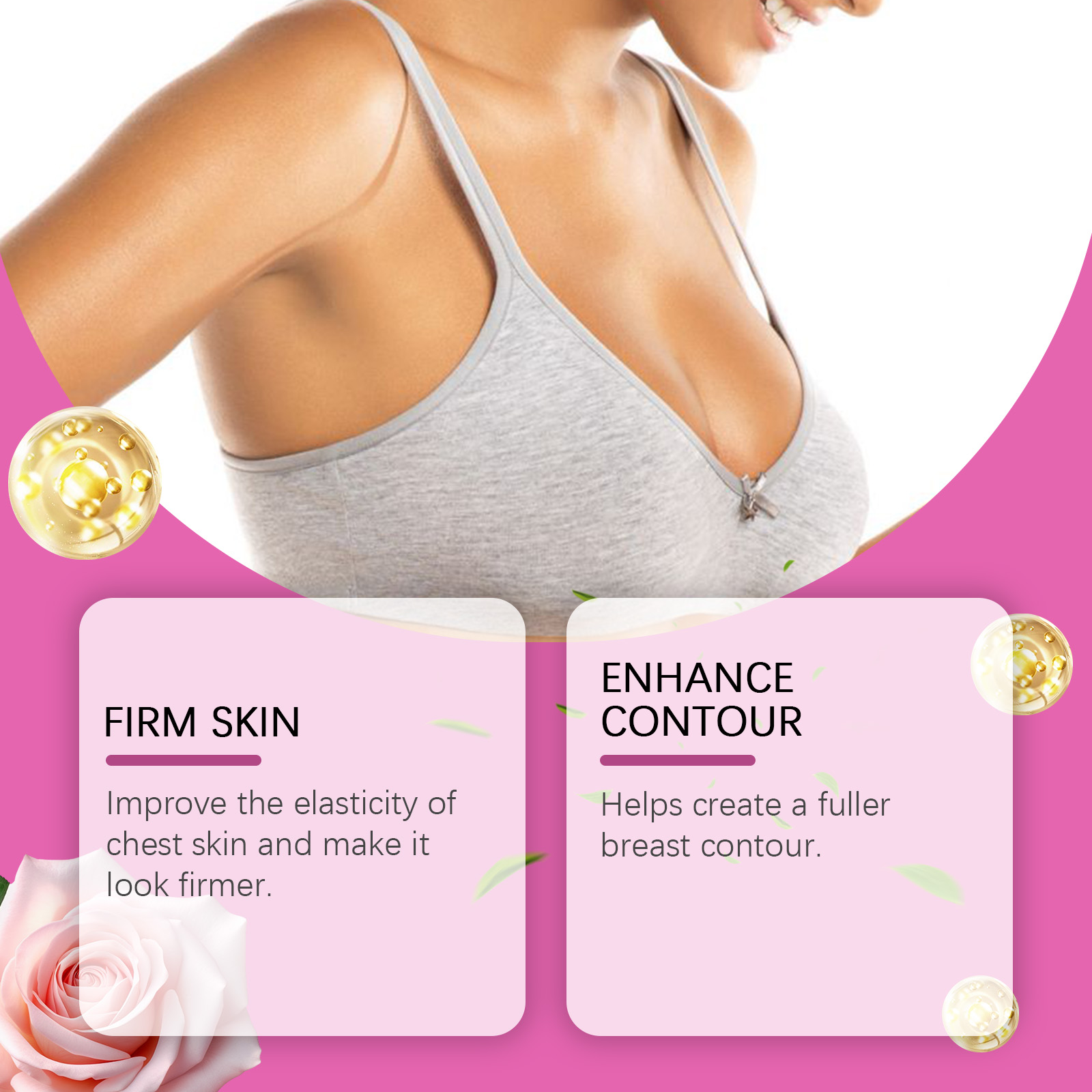 Our breast massage cream contains mango seed oil, glycerin, tea leaf extract. It can improve the elasticity of the skin on the chest, making it look firmer. Helps create a fuller breast contour. Its application method is very simple: 1. Wash the chest skin and keep it dry; 2. Apply appropriate amount of the product evenly on the chest skin, gently massage in circular motion until absorbed. Deep nourishing chest skin, improve dry skin slack.