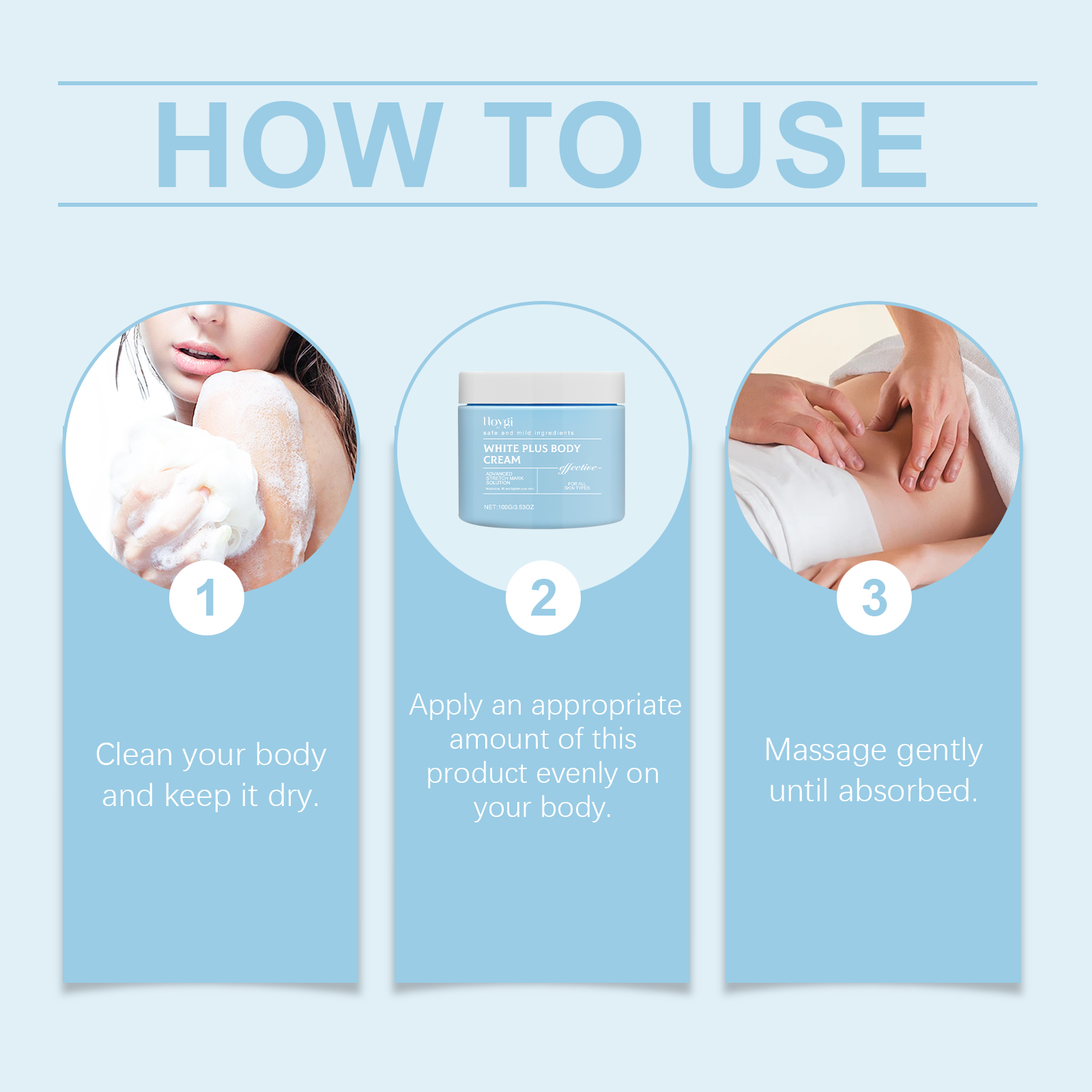 Our body moisturizers contain squalane, vitamin E (tocopherol). It can effectively lighten the complexion and make the skin glow. The way to use it is simple: clean the body and keep it dry. Apply appropriate amount of this product evenly to the body. Gently massage until absorbed. It can also help improve skin firmness and keep skin smooth and delicate.