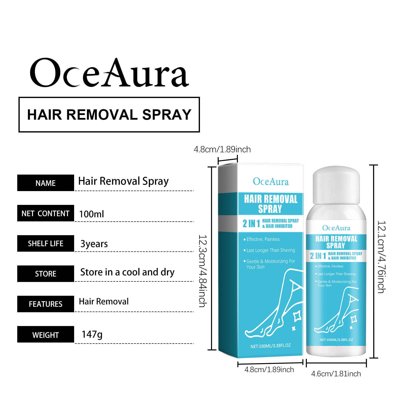 OceAura Hair Removal Spray Refreshing Moisturizing Gentle Smooth Hand Hair Leg Hair Skin Gentle Formula Hair Removal Spray
