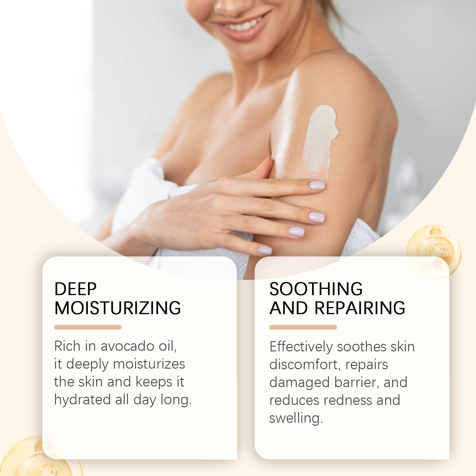 Our moisturizing butter Cream contains avocado oil and vitamin D. It can improve skin relaxation, enhance skin elasticity, make skin firm and fast absorption, not greasy, keep skin fresh and comfortable. Its use method is very simple: thoroughly clean the skin, dry it first, apply appropriate amount of this product evenly on the face, hands, feet, elbows, knees and other body skin, gently massage until absorbed. And can effectively relieve skin discomfort repair damaged barriers, reduce redness.