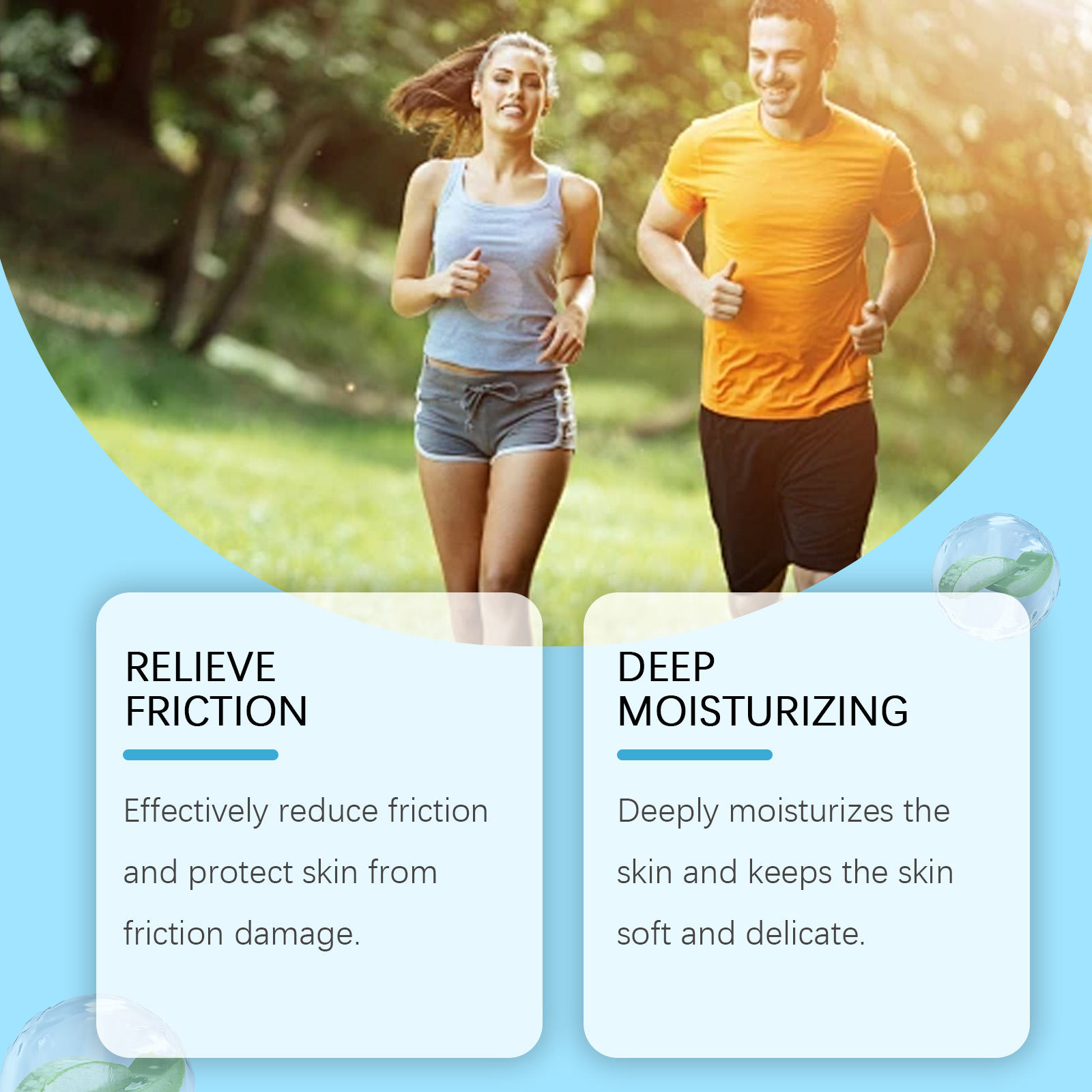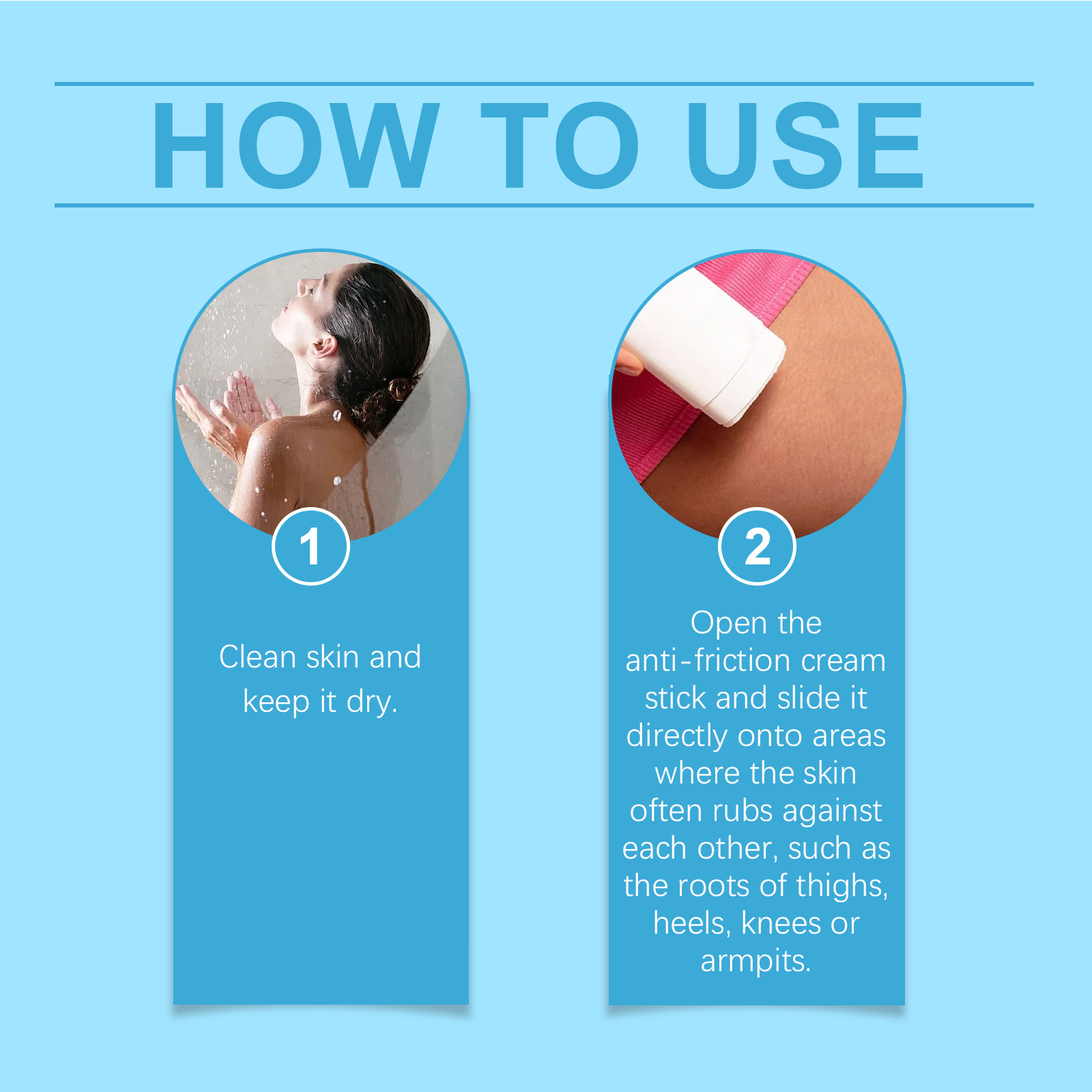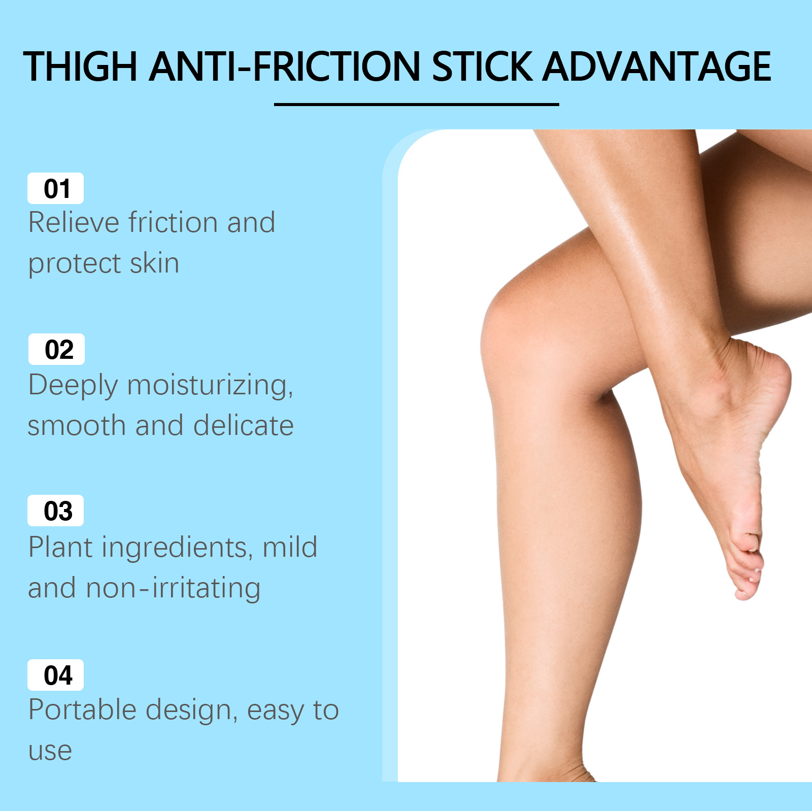 Our moisturizing anti-friction stick contains aloe vera extract, pomegranate extract and grapeseed oil. It can effectively reduce friction and protect the skin from friction damage. Deeply moisturize skin and keep skin soft and delicate. The way to use it is simple: 1. Clean your skin and keep it dry. 2. Turn on the anti-friction cream and apply it directly to areas of your skin that often rub against each other, such as the base of your thighs, heels, knees, or armpits. Selected natural ingredients, mild and non-irritating. Form a protective film on the surface of the skin to effectively resist the erosion of sweat and moisture.