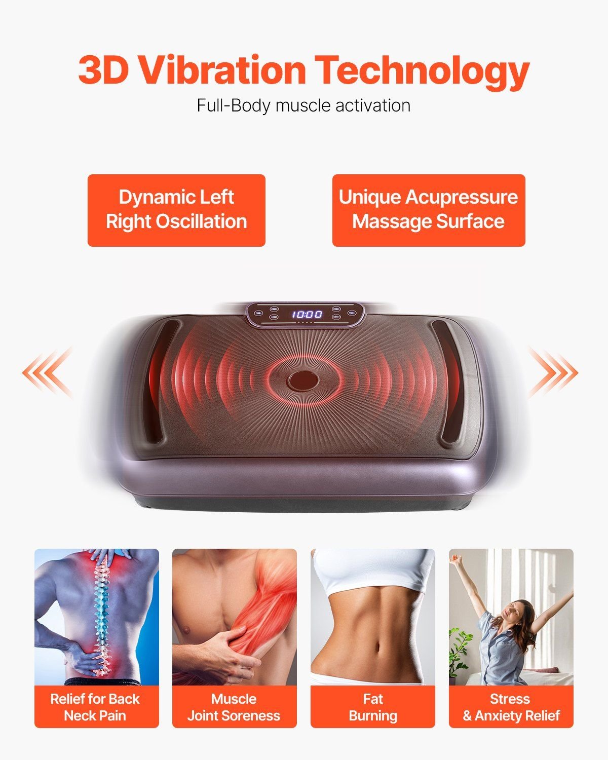 1.Full-Body Muscle Activation: Using advanced 3D vibration technology, the left-right oscillation targets all muscle groups. The acupressure surface helps relieve pain, supports fat burning, and reduces stress, anxiety, and muscle soreness